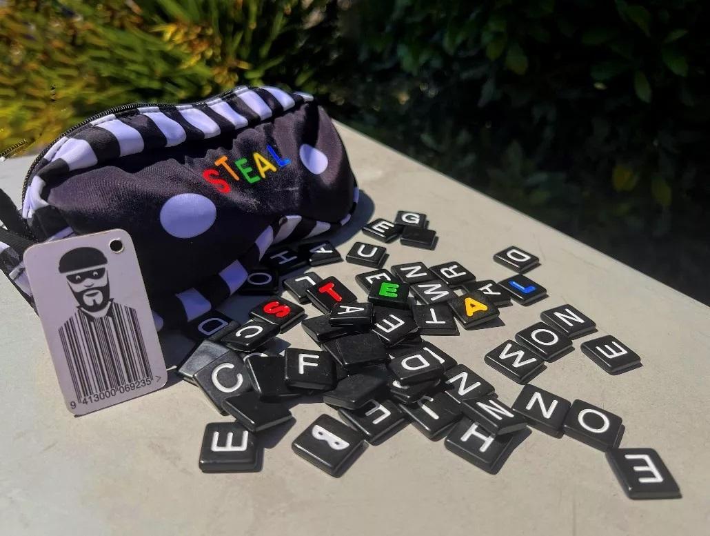 Steal is a fast and furious new letter game of cunning, treachery and outright theft! A hugely exciting game from New Zealand, with all letter tiles contained in a handy mask-shaped fabric bag, allowing it to be played almost anywhere. Steal is suitable for 2–8 players of all ages, easy to learn but more difficult to master.Play proceeds by flipping tiles (every 2–3 seconds), with players calling out and forming three+ letter words from the exposed letters. As the game proceeds, the aim then is to steal words from your opponents by adding one or more letters. So pin might be stolen as pain, and stolen again as inapt, then pliant, implant, platinum, manipulate, planetarium, perambulating etc…! All the while other words are of course being formed and stolen.The set contains ten coloured STEAL letters which double the score of the word, so the highest scores are always obtained by assembling/stealing long words containing a coloured letter. Play is further enhanced by the mask (joker) tile which can be any letter you want (& can change as the word is stolen).Flipping stops while words are being assembled (with the last assembler being next to flip) but stealing does not. So often a word is stolen whilst it is being formed with the addition of an already-exposed new letter! Frustrating and hilarious at the same time, bringing out the competitive streak of everyone who plays. Once all letters are flipped and no more words can be made or stolen…the scores are counted up to find the winner.