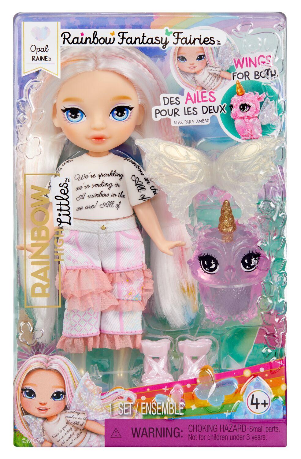 Rainbow High Littles are stepping into a magical world alongside their big sisters—and now, they have wings!These adorable Littles feature interchangeable fantasy fairy wings that can also be swapped with their enchanted pets. Each 5.5” poseable doll comes with a removable outfit, stylish shoes, brushable hair, and mesmerizing clear legs.Collect the rainbow; Astrid dazzles in rainbow with her Butterfly, Apple shines in red with her Deer, Emerald sparkles in green with her Dragon, Sapphire stuns in blue with her Dog, and Opal enchants in rainbow with her Owl.*Features:** FANTASY OWL PET. Comes with a super cute magical flying pet whose wings are interchangeable with her.* ADORABLE RAINBOW FEATURES. Each doll has their own unique rainbow style; dressed in a cute, molded top and soft pants. Has long brushable rainbow hair. And her magical clear legs are tinted with her signature rainbow color.* SMALL DOLL THAT’S POSEABLE. She is the perfect height for her age, 5.5”. And because she is articulated at the head, shoulders and legs, she is so easy to pose.* WHAT'S INCLUDED. 5.5” Small poseable fairy doll, removable outfit & shoes, magical flying pet with horn. And the fairy comes with fairy wings that are interchangeable between the doll and her magical flying pet.* COLLECT THEM ALL. Astrid, Apple, Emerald, Sapphire, Amethyst and Opal.* Suitable for ages 4+