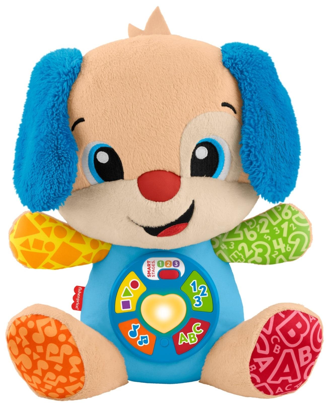 Laugh & Learn Smart Stages Puppy from Fisher-Price is a snuggly plush musical toy that introduces baby to the alphabet, shapes, first words and more! Little ones can press the 5 buttons on Puppy’s tummy to see his heart light up in different colors as 80+ songs, sounds and phrases play. Featuring more than 12 original songs and 3 Smart Stages learning levels that grow along with your child from infant to toddler, Smart Stages Puppy is sure to be baby’s best friend. Requires 3 AA batteries, included.*Features:** Puppy comes with Smart Stages™ technology, so you can choose the level that's best for your child. There are a variety of songs, sounds and phrases within each of the three levels of play. And Puppy's light-up, multicolor heart even twinkles along to the music!* Level 1 – Explore – Baby can press Puppy's hands, foot, heart, nose or ear to hear first words, colors, the alphabet, parts of the body and more!* Level 2 – Encourage – In this level, fun phrases reward little ones as they're encouraged to count along, find colors, and identify parts of the body!* Level 3 – Pretend – Puppy's ready to play pretend with fun sing-along songs and phrases that engage toddlers in exciting and imaginative play, all while expanding their vocabulary!* 75+ songs, sounds, tunes & phrases!* Puppy’s hands, foot, ear, and light-up heart respond to baby’s touch (5 activations in all!)* Teaches 100 first words & introduces parts of the body, shapes, counting, the alphabet and more!* 3 Smart Stages™ learning levels to grow along with your child.* Press & hold Puppy’s light-up heart to hear all his songs!