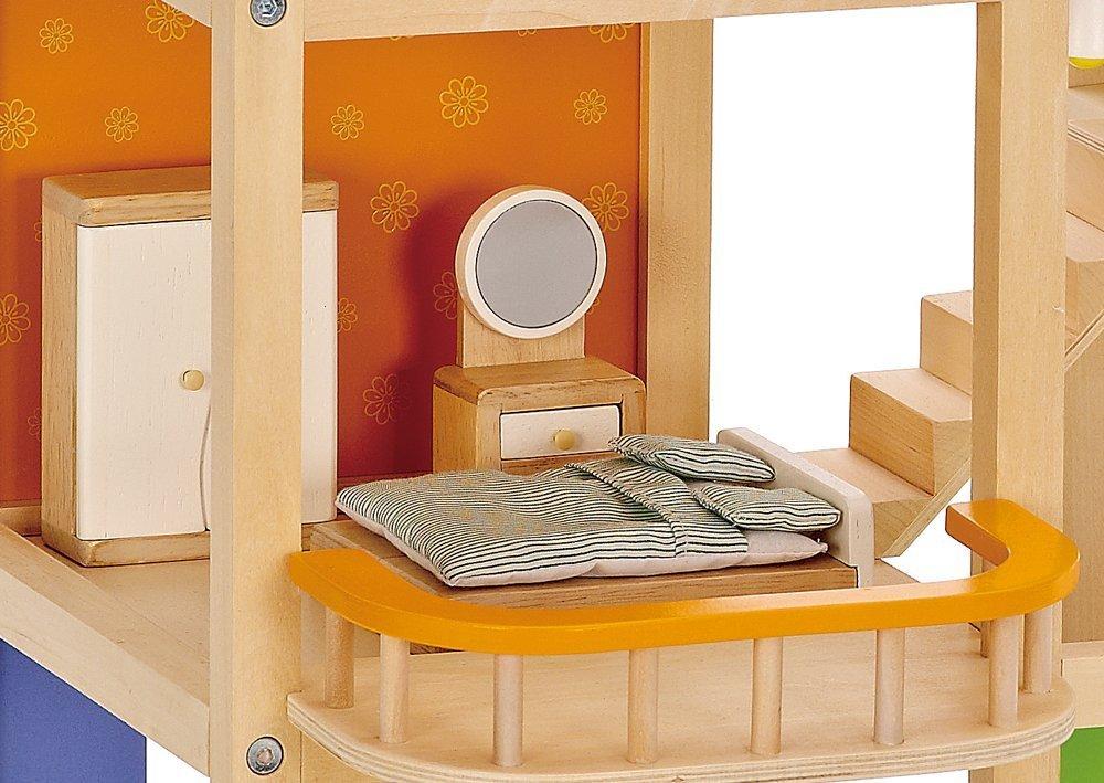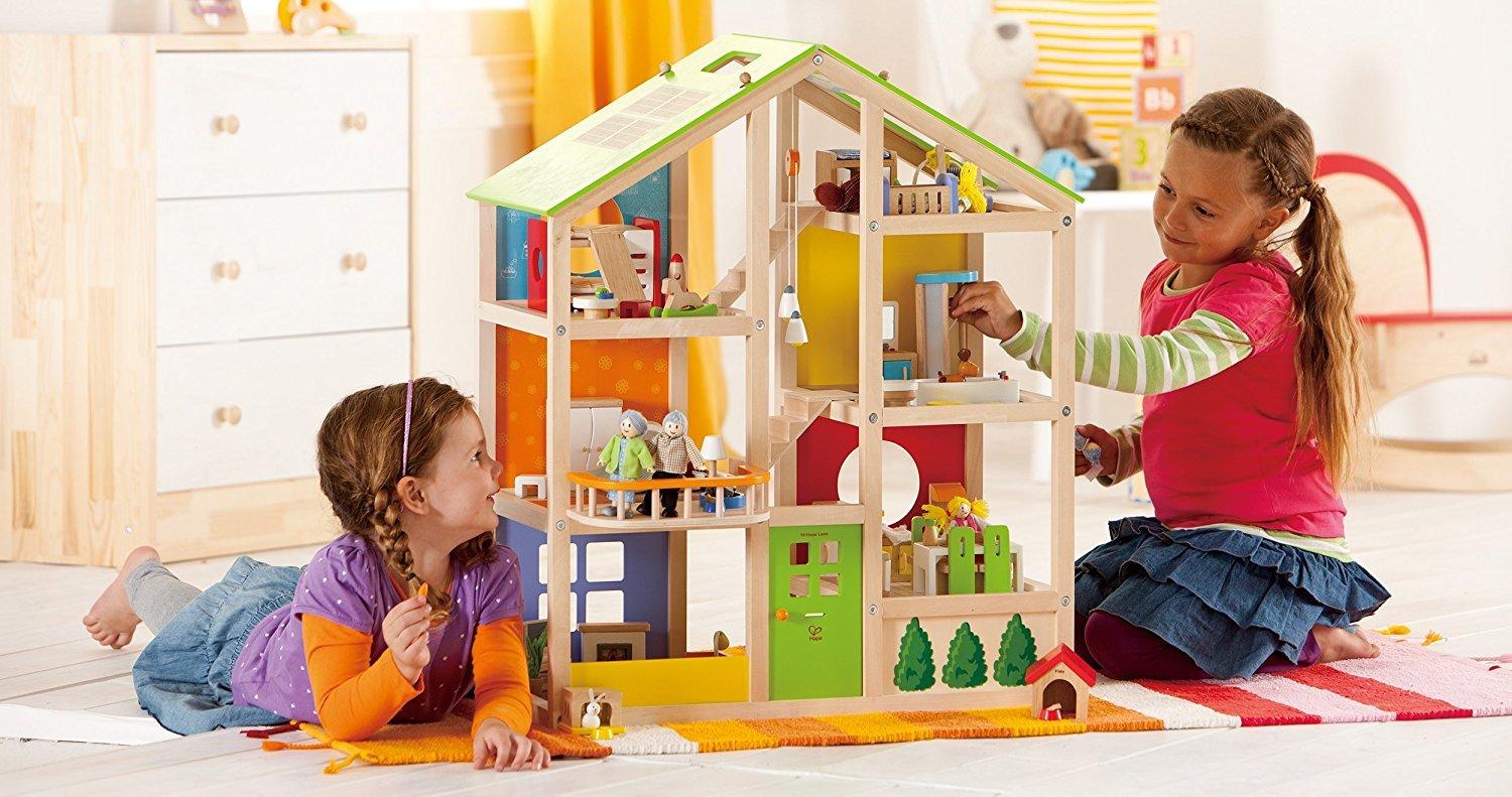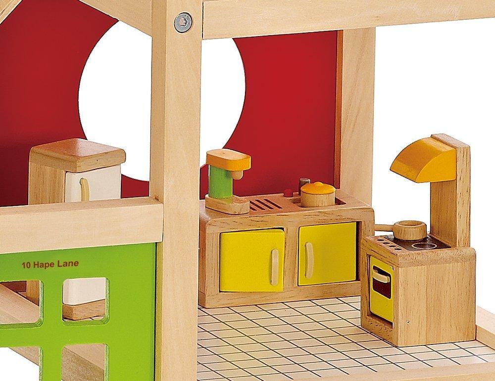 There are as many ways to play with this wooden doll house as families in the world. Six rooms, moveable stairs, and a reversible winter/summer-themed, solar-paneled roof inspire year-round activities.Includes four room sets of furniture: Master Bedroom, Family Bathroom, Media Room and Kitchen (dolls sold separately).* The All-Season House is great for pretend family play year round* Includes four room sets: Master Bedroom, Family Bathroom, Media Room and Kitchen* Easy assembly with clearly illustrated instructions included* Materials include Baltic Birch, Maple and Rubberwood from FSC managed forestsDurable child safe paint finish and solid wood construction are hallmarks of Hape toys. Hape's toys stimulate children through every stage of development and help nurture and develop their natural abilities.Dolls not included (sold separately).For ages 3 to 8 years