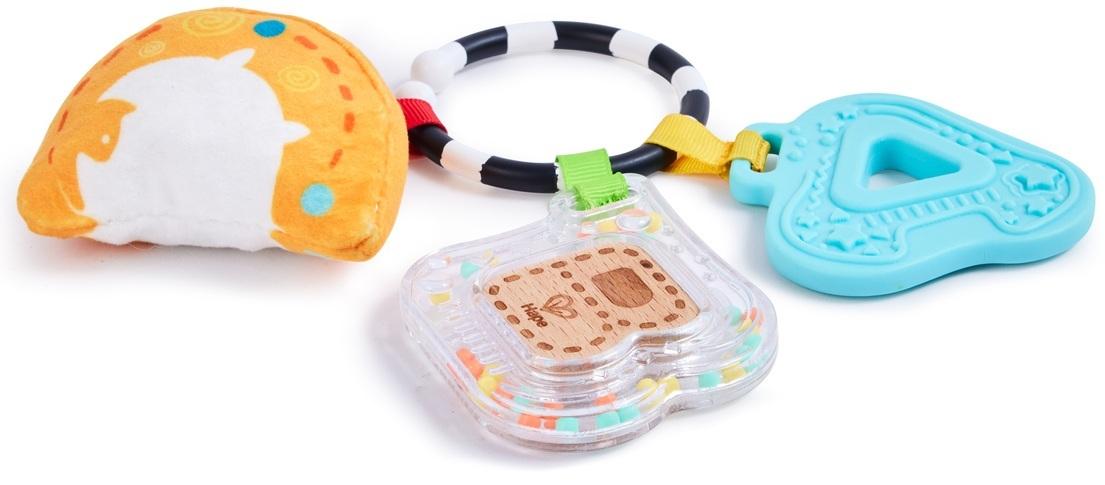 Portable baby sensory fun! This all-in-one teether, rattle, and plush toy has engaging textures, colours, and sounds.Encourage the exploration of textures, colors, and sounds. Let your baby grasp the rattle, chew on the teether, and engage with the plush toy. Easily attach it to a stroller for on-the-go fun for ongoing sensory development.*Features:** MULTI-PIECE SET: Includes a teether, a rattle, and a plush toy, all connected with a black & white ring for easy travel and hanging.* MULTISENSORY EXPERIENCE: The various textures, bright colours, and gentle sounds help stimulate babies` senses, promoting their cognitive development.* PORTABLE AND VERSATILE: Designed for easy transport and hanging, this set is convenient for on-the-go entertainment and ongoing sensory stimulation for babies.