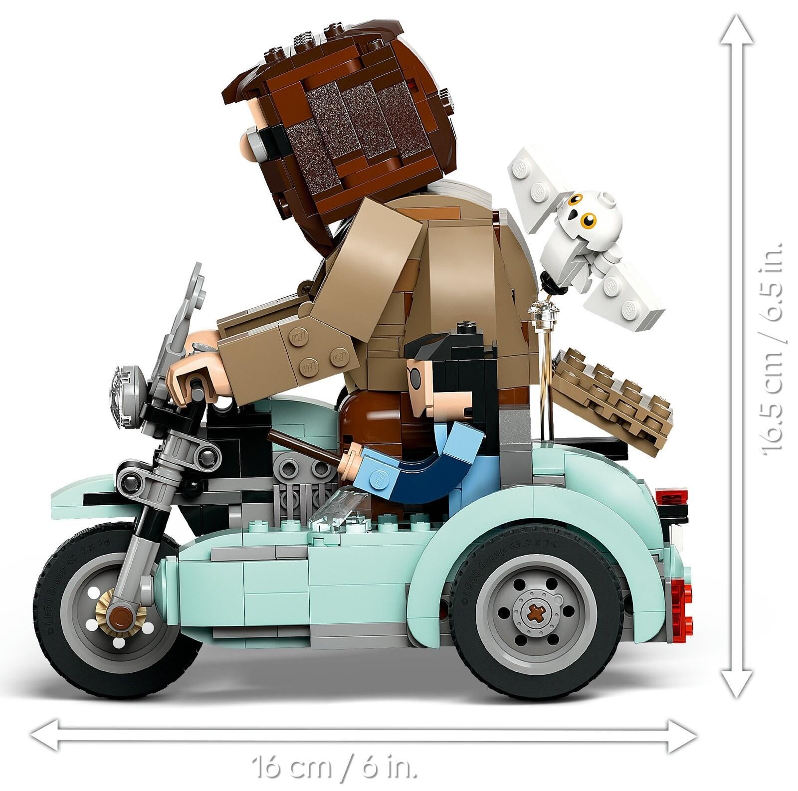 *A magical birthday gift for kids who love Hagrid*Hold on tight for Hagrid & Harry’s Motorcycle Ride (76443) with this magical toy for girls, boys and any fans of the Wizarding World. A cool birthday gift for kids aged 9 and over, this LEGO Harry Potter play-and-display set features built-in, posable Harry Potter, Hedwig and Rubeus Hagrid toy figures riding on a motorbike and in its sidecar. The LEGO brick-built vehicle toy’s wheels turn so kids can play out iconic Harry Potter and the Deathly Hallows scenes, or the model can be displayed as striking Harry Potter room decor.Give your youngster an easy and intuitive building adventure with the LEGO Builder app, which lets them zoom in and rotate their model in 3D, track their progress and more.A wizard toy for fantasy adventure fans, this set is part of an extensive collection of LEGO Harry Potter sets (sold separately) to excite the imaginations of young witches, wizards and Muggles.*Features:*\* Magical toy play-and-display set for kids, featuring Hagrid’s motorcycle\* The model features built-in Harry Potter, Hedwig and Hagrid toy figures\* A fun building challenge to capture the look of beloved character Rubeus Hagrid\* Drive Hagrid’s flying motorbike and pose the 3 characters\* Birthday gift for kids aged 9 and over and any fans of the Wizarding World\* Save progress, zoom in and rotate the model in 3D with the LEGO Builder app\* Part of an extensive range of LEGO Harry Potter sets, sold separately\* This 617-piece play-and-display model measures over 16 cm (6.5 in.) high*Specifics:**Item*: 76443*Pieces*: 617*Ages*: 9+