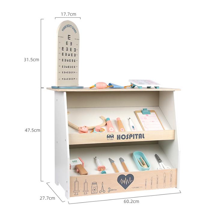 *_Kids Montessori Hospital Wooden Play Set and Accessories_**Kids Doctor Role-Play Set — Inspire Imagination & Build Confidence**Build, Learn, and Grow Through Play*Encourage empathy, communication, and curiosity with this engaging doctor role-play set. Designed for children aged 3–6, this set combines realistic tools, interactive play, and a safety-first design — making it the perfect addition to any playroom or learning space.*Key Features**Role-Playing Fun* Helps children overcome their fear of doctor visits by stepping into the shoes of a little doctor.*Realistic Tools* Provides an authentic experience with lifelike, kid-friendly medical instruments.*High-Quality Wood* Crafted from top-grade beech wood, meticulously sanded for a smooth, durable finish that stands up to years of play.*Exquisite Craftsmanship* The elegant cream-colored design adds a touch of style, blending seamlessly into your home decor.*Scene Simulation* Encourages imaginative role-play and scenario-based games, fostering creativity and storytelling skills.*Realistic Tools: Provides an authentic experience with lifelike, kid-friendly medical instruments**Patience & Concentration* A fun way to foster focus, patience, and perseverance as children build and experiment.*Specifications** Dimensions: 23 cm (L) x 65 cm (W) x 101.5 cm (H)60.2 cm (L) x 27.7 cm (W) x 47.5 cm (H)17.7 cm (L) x 17.7 cm (W) x 31.5 cm (H)* Weight: 14 kg* Recommended Age: 3–6 yearsFrom checkups to pretend surgeries, this doctor play set turns ordinary playtime into a rich learning experience. It encourages kids to explore medical care, build confidence, and strengthen bonds with friends and family. Bring home a playset that sparks curiosity and nurtures future healers!