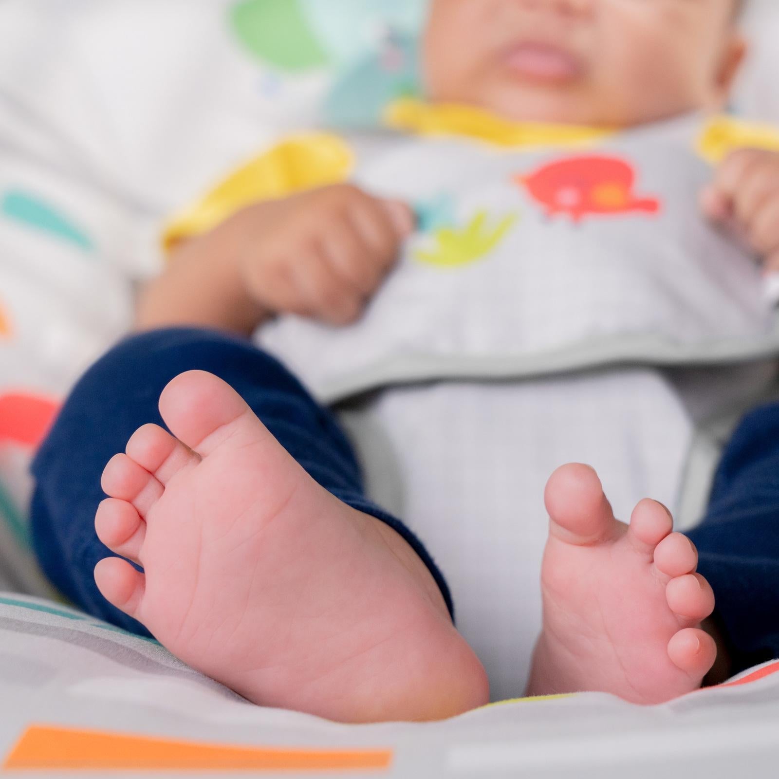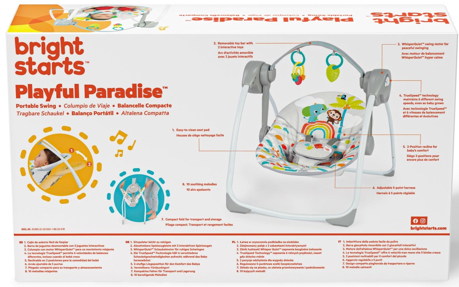 *_Bright Starts: Playful Paradise Portable Swing_*Treat baby to a breezy vacation state-of-mind with the Bright Starts Playful Paradise Portable Swing. Like palm trees swinging in the breeze, your baby will peacefully sway in this comfy seat or leisurely play with interactive toys.*Features:** You’ll love knowing you can safely rest your little one securely in your sight.* With its 2-position recline, this swing is sure to feel just right for baby’s preference. The 2 nature-inspired toys, cheerful rainbow design, and elephant and monkey friends will keep your baby in good swinging company.* Features an easy-to-remove toy bar so you can easily access your baby.* With 10 cheerful melodies, swing time is song time, and an adjustable five-point harness keeps baby snug in their deep comfortable seat.* Compact as it is cozy, the lightweight and foldable design makes it easy to pack up this baby swing for travel or storage.* TrueSpeed™ technology means you can choose from 6 swing speeds, even as baby grows from newborn to infant.* WhisperQuiet™ technology, the only sounds you’ll hear are the sweet sighs and babbles from your happy baby.* Swinging and songs powered by 4 C batteries (not included).