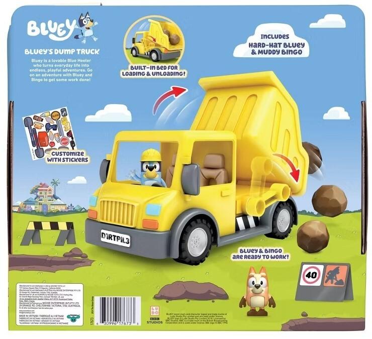 *Bluey: Dump Truck*Go on an adventure with Bluey and Bingo to get some work done with Bluey's Dump Truck! Bluey has her hard-hat on and Bingo has been having some fun in the mud. These exclusive figures are the perfect size for pre-school hands to play with, and are articulated so they can sit in the cabin of the Dump Truck!Help Bluey and Bingo load and unload 3 big rocks by moving the lever on the side of the truck to make the built-in bed tilt up and down. Put out the included safety signs so they can get the job done! Kids can even customize the Dump Truck with the included sticker sheet. Toddlers will love to recreate some of the most memorable moments from the show with these fun toys!*Features:** Bluey's Dump Truck features a movable lever to load and unload 3 big rocks, with a tilting bed for realistic play.* Bluey's Dump Truck Includes exclusive 2.5 inch / 6.35 cm Hard-Hat Bluey and Muddy Bingo figures.* Put out the included safety signs so Bluey and Bingo can get the job done.* Includes a fun sticker sheet to customize the Dump Truck.* Designed for preschool hands, making it easy for kids to recreate their favorite moments from the show.*Suitable for Ages 3+*