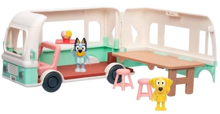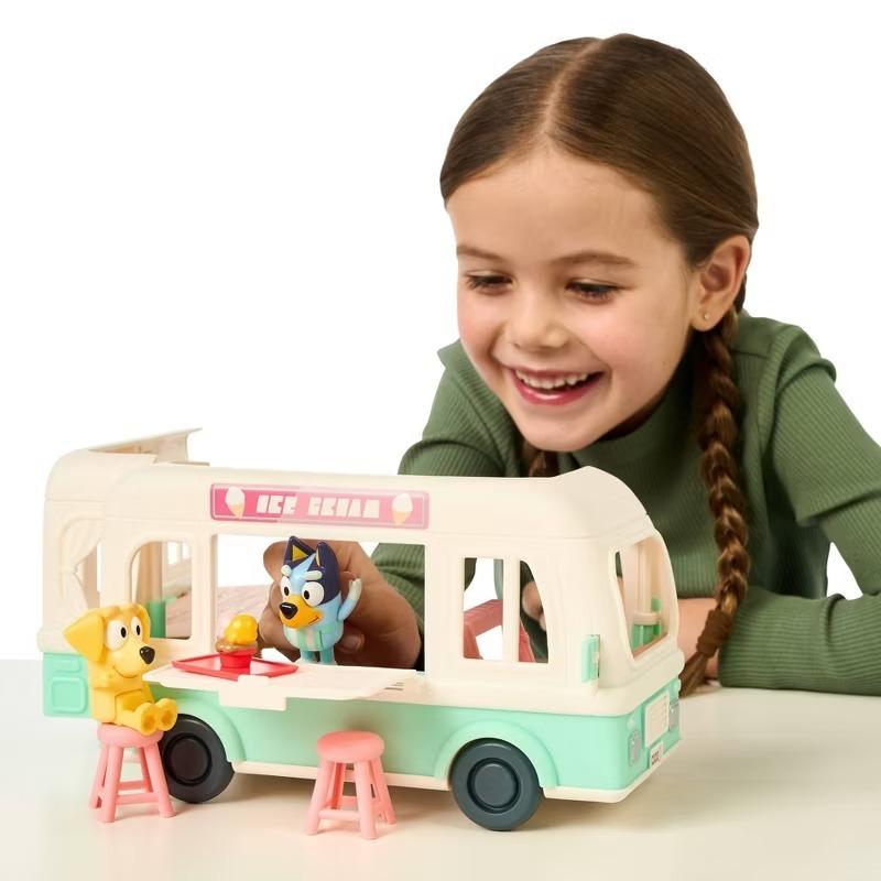 *Bluey: Holiday Ice Cream Truck*Go on an adventure with Bluey and her friend Lucky in Bluey's Ice Cream Truck! This playset is full of fun as it folds out and transforms into an ice cream parlor! Open up the truck to reveal a cool raised deck with table and chairs for hungry customers. Bluey's dressed in her apron, so drop down the window to serve all of her friends.There's even a delicious looking ice cream on a tray! Customize and decorate the Ice Cream Truck with the included sticker sheet. When you're done for the day, fold up the truck and hit the road. The Bluey and Lucky figures are articulated and can sit on the truck's seats to ride! They are just the right size for pre-school hands to move and play with. Children and toddlers will love to recreate some of the most memorable moments from the show and create their own Bluey adventures with these adorable Bluey toys!*Features:** Go on an adventure Bluey and her friend Lucky in Bluey's Ice Cream Truck Playset.* This Ice Cream Truck Playset is full of fun as it folds out and transforms into an ice cream parlor.* Includes lots of play pieces to serve up and enjoy an ice cream sundae.* Includes 2.5" Bluey and Lucky articulated figures. Bluey is dressed in her exclusive apron.* Customize and decorate your Ice Cream Truck with the included sticker sheet.*Suitable for Ages 3+*
