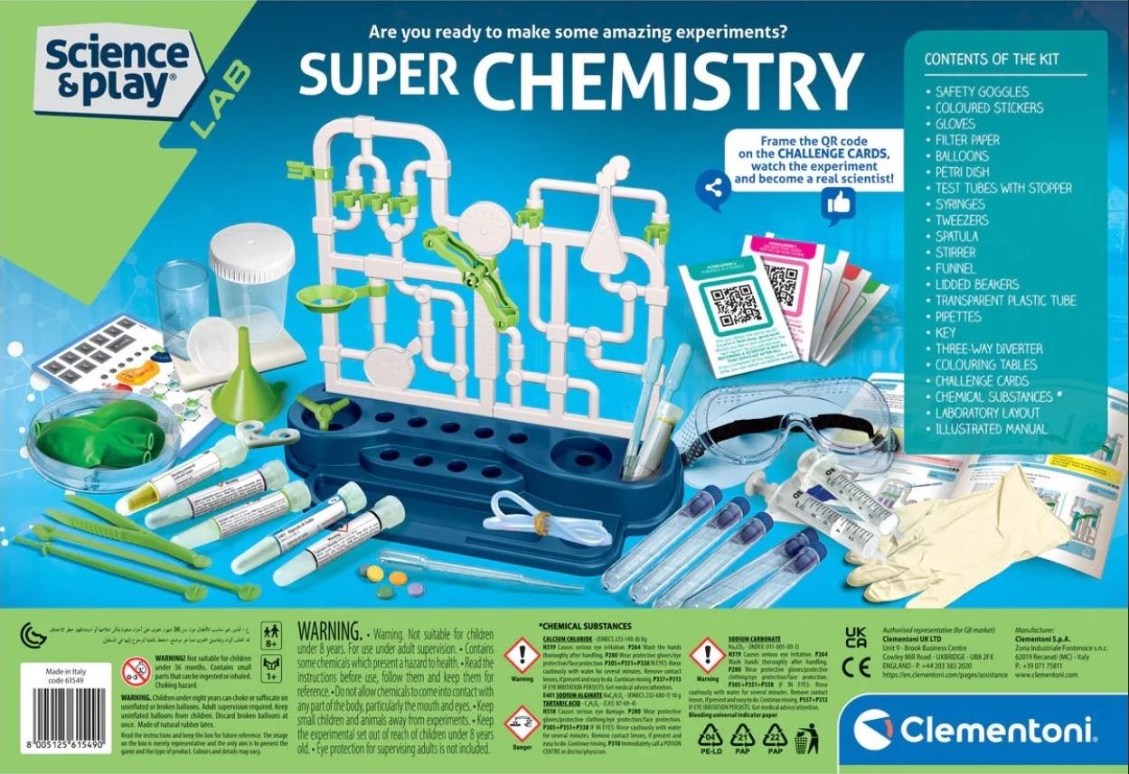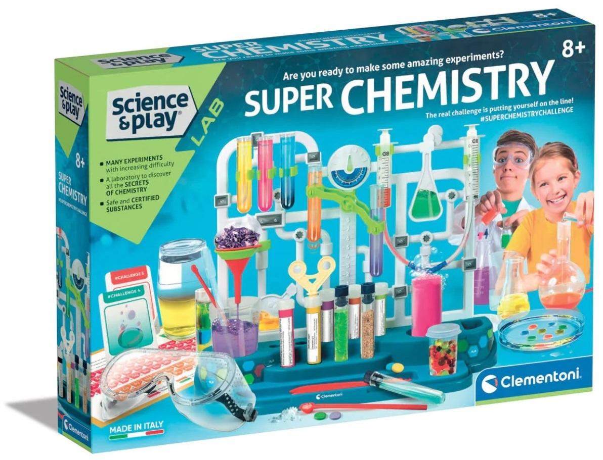 *Clementoni: Science Lab – Super Chemistry*A game that introduces children to a notoriously complicated subject while they delight in experimenting with a brand-new laboratory featuring an attractive design! All the instruments of a real scientist for arousing keen interest in this incredible scientific subject. A unique and functional design for many different experiments! An area reserved for solutions and filtrations, one for measuring and weighing substances and a workbench for making chemical reactions.A comprehensive manual with experiments arranged into levels of increasing difficulty, starting from the easiest ones to those requiring several steps to complete for amazing results. The play experience extends beyond the product to explore a new field of application in the digital sector for an increasingly challenging approach. Five experiments for a big challenge: only by framing the cards and following the online tutorial can the child find out whether the experiment was successful and share the outcome with friends! Conceived, designed and developed in Italy.*Features:** Many experiements with increasing difficulty* A laboratory to discover all the secrets of Chemistry* Safe and certified substances*For Ages 8 and up*