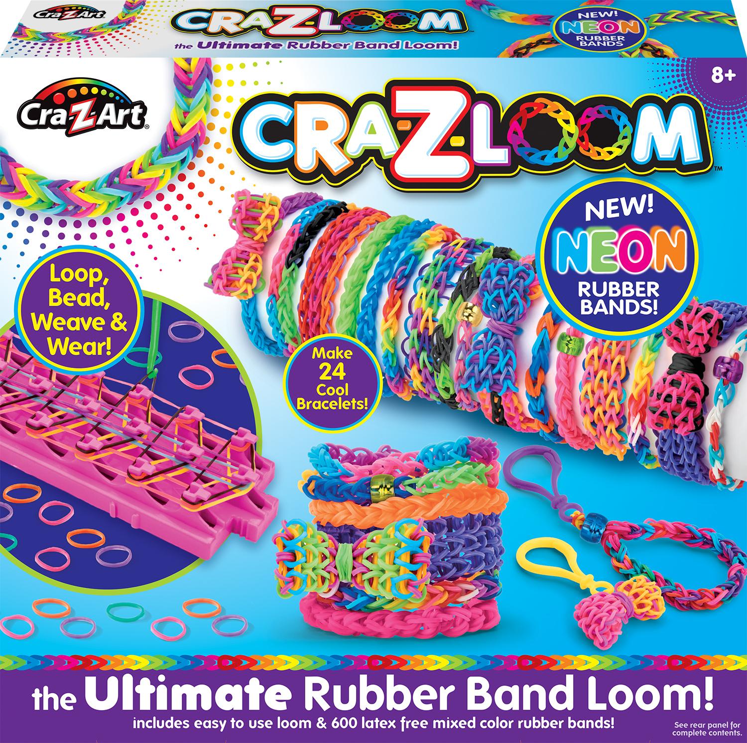 Cra-Z-Loom is the Ultimate Rubber Band Bracelet Maker where Girls and Boys are creating hundreds of their own personalized bracelets to wear and share.Get the Hottest and Best Bracelet Maker in the world and start creating your own world of Rubber Band Bracelets. The ultimate rubber band loom. Loop, bead, weeve and wear.Makes 24 cool bracelets.Includes Loom and 600 latex free rubber bands.