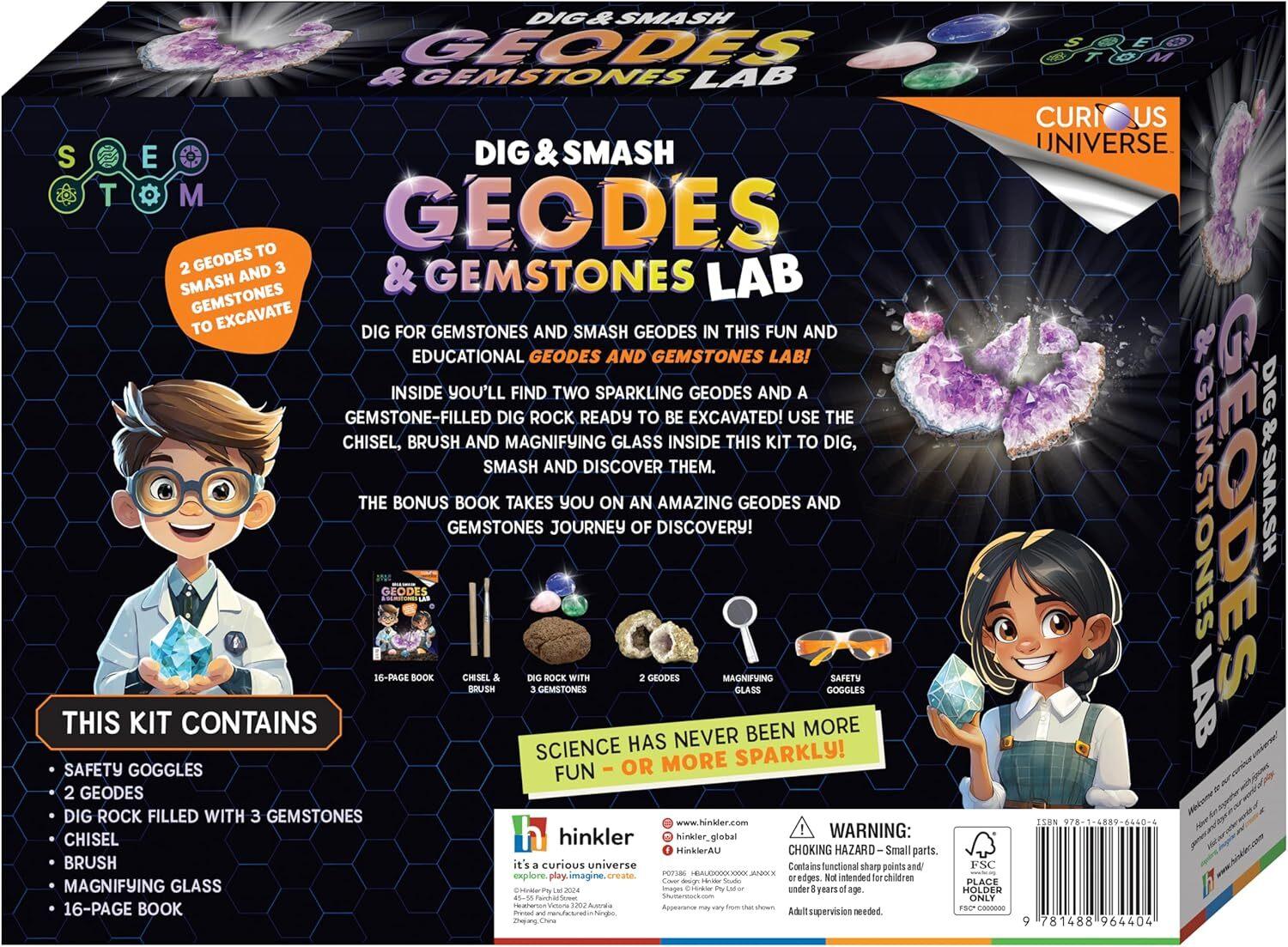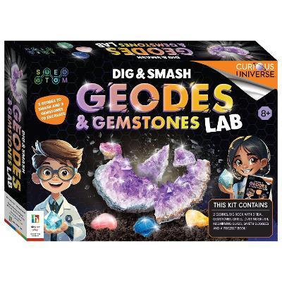 *Curious Universe Science: Dig & Smash Geodes Kit*Excavate gemstones and smash geodes with this educational kit that combines fun with learning.*Features:** Includes safety goggles, chisel, brush, magnifying glass, 2 geodes, a gemstone-filled dig block, and a 16-page project book.* Engages kids in science through play by exploring geology and gemstones.* Encourages curiosity and discovery, ideal for young explorers aged 8–12.* From the Curious Universe range, a series known for blending education and fun.*Suitable for Ages 8+*