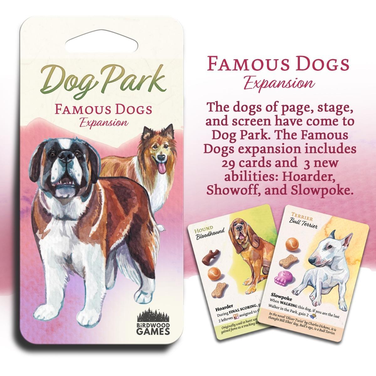 Welcome to Dog Park, a competitive set collection and point-to-point movement game about walking all your favourite dogs.In Dog Park, you and your friends will take on the role of dog walkers recruiting, walking, and caring for your dogs over four rounds. In each round, you will journey through the Dog Park with your pups to collect resources, earn reputation, and interact with your fellow walkers. Choose your routes and dogs carefully to earn the best reputation and prove you are the most accomplished walker of them all.The dogs of page, stage, and screen have come to Dog Park. The Famous Dogs expansion includes 29 dog cards with 3 new abilities: Hoarder, Show Off, and Slowpoke.