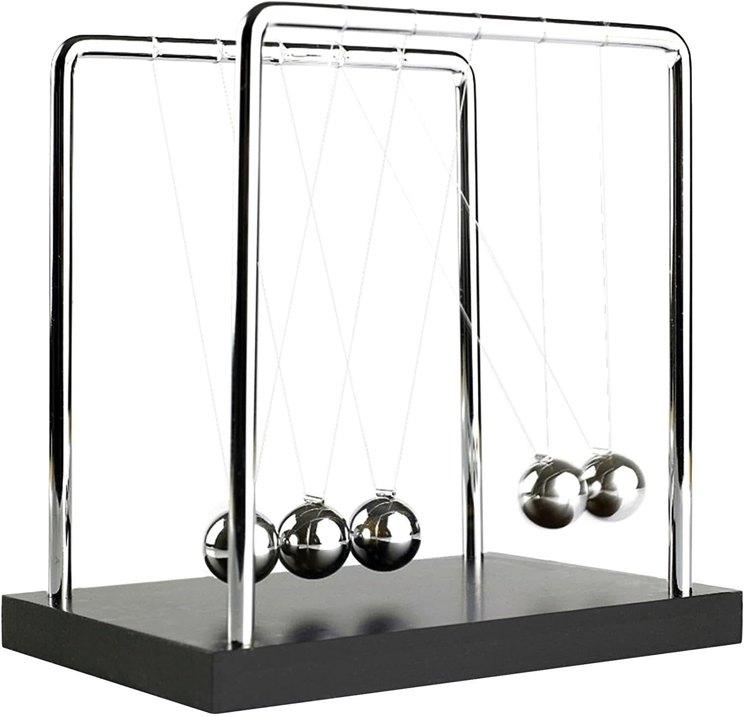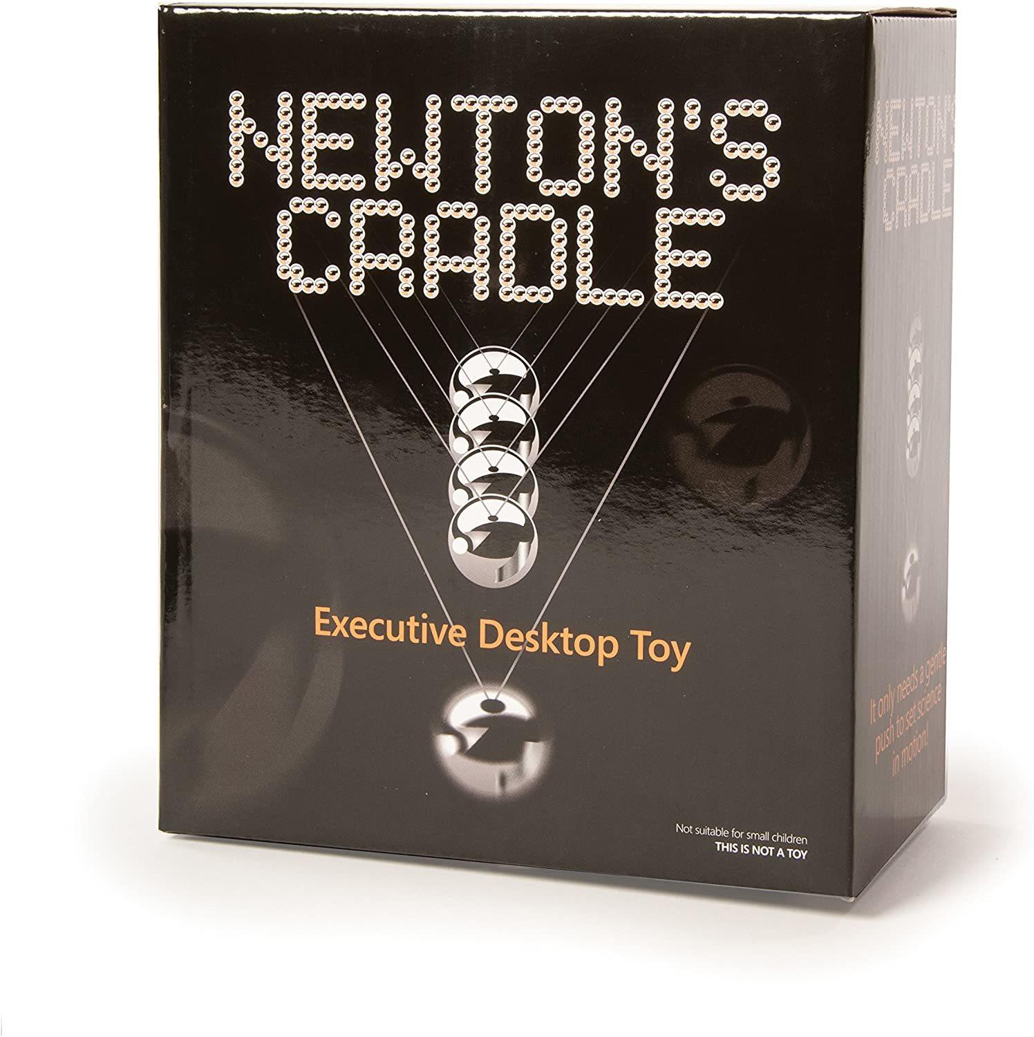 *Funtime: Newtons Cradle*For every action, there is an equal and opposite reaction.Named after the famous scientist Sir Isaac Newton this executive toy perfectly demonstrates conservation of energy and momentum. Each ball is attached to opposite sides of the frame by equal-length strings. Pull back and release one of the balls and let it swing back, creating a force that propagates through the other balls creating a hypnotic motion.Great Executive gift. Comes assembled. Individually boxed.*Features:** It just takes a gentle push to set science in motion.* Pull back and release one of the metal balls to create a propagating display of physical movement.