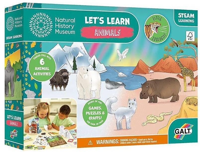 *Galt: Let's Learn – Animals*Let's learn all about animals with this bumper kit of wildly fun learning activities! This set includes 6 projects with beautifully illustrated activity cards full of animal facts to encourage early STEAM learning (Science, Technology, Engineering, Arts and Maths).If you love animals, then you'll love these games, puzzles and crafts, all about your favourite creatures from around the world and others you may not even have heard of. Developed with the Natural History Museum, these kits with their bite-sized activities and step-by-step instructions will inspire a love of the natural world and will help develop vital skills for all future scientists!*Features:** Wildly fun learning activities* Encourages early STEAM learning* Inspires a love of the natural world*Suitable for Ages 4+*