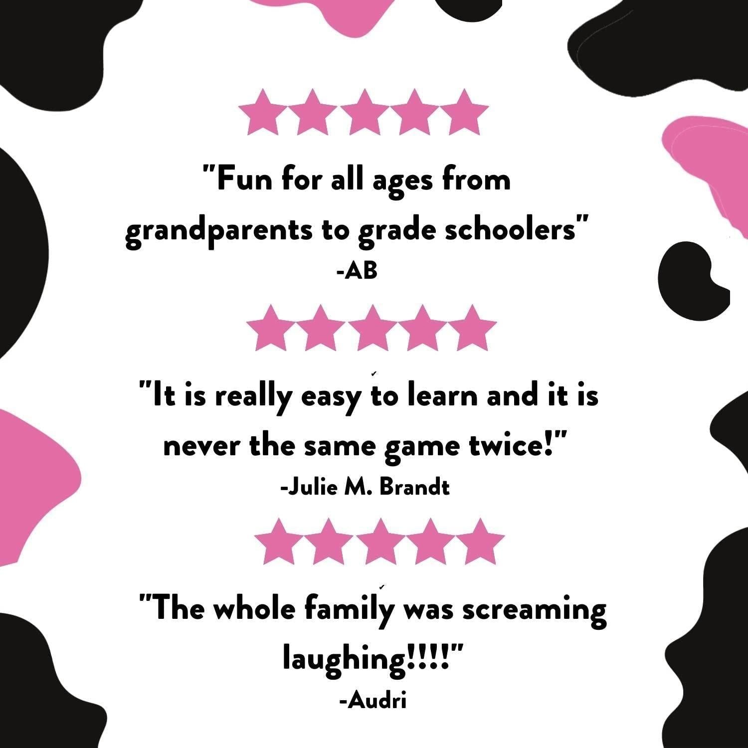 Think like a cow. Herd Mentality is a social deduction family party board game with a simple black and white mission: write down the same answer as everyone else. It starts with a random question: for example “What’s the largest fruit you could get in your mouth without chopping it up?” Everyone secretly writes down an answer. If your answer is in the majority, you win cows. But if your answer is the odd one out, you’ll land the Pink Cow and your herd will be worthless — unless you can pass it on! The Question Wrangler reads out a card. Each player (including the Question Wrangler) writes down an answer in secret. When everyone’s ready, it’s time to reveal the answers one by one, starting with the Question Wrangler. When all the answers have been revealed, count them up to find out which was the most common answer. If you were one of the players who wrote it, collect one cow as a reward. Your herd just got a tiny bit bigger. “” If you were the only player who wrote an answer that didn’t match with anyone else’s, then you’re the odd one out. For your punishment, you must add the Pink Cow to your herd. The only way to get rid of the Pink Cow is for another player to be the odd one out in a later round. While you’re holding the Pink Cow, you can’t win the game — no matter how big your herd becomes. If you’ve got the Pink Cow, you can still collect more cows, but they aren’t worth anything unless you can pass it on.” Comes with a cow pen where you can round up the Cow Tokens and the Pink Cow.* WANNA JOIN THE HERD? Flip over a question, grab a pencil and follow the crowd in this family strategy board game.* WOULD YOU RATHER HAVE ROBOT ARMS OR ROBOT LEGS? Don’t know the answer? Try to figure out what everyone else would write! If your answer is in the majority, you win cows.* LET CATTLE COMMENCE! If your answer is the odd one out, you’ll be given the dreaded Pink Cow and you’ll have no chance of winning… until you can moo-ve it on to someone else.* WHATEVER YOU DO, DON’T STAND OUT: This is a Social Deduction game to put all the others out to pasture.* EASY TO LEARN, QUICK TO PLAY. One of the most udderly amoosing new family board games for 2020.