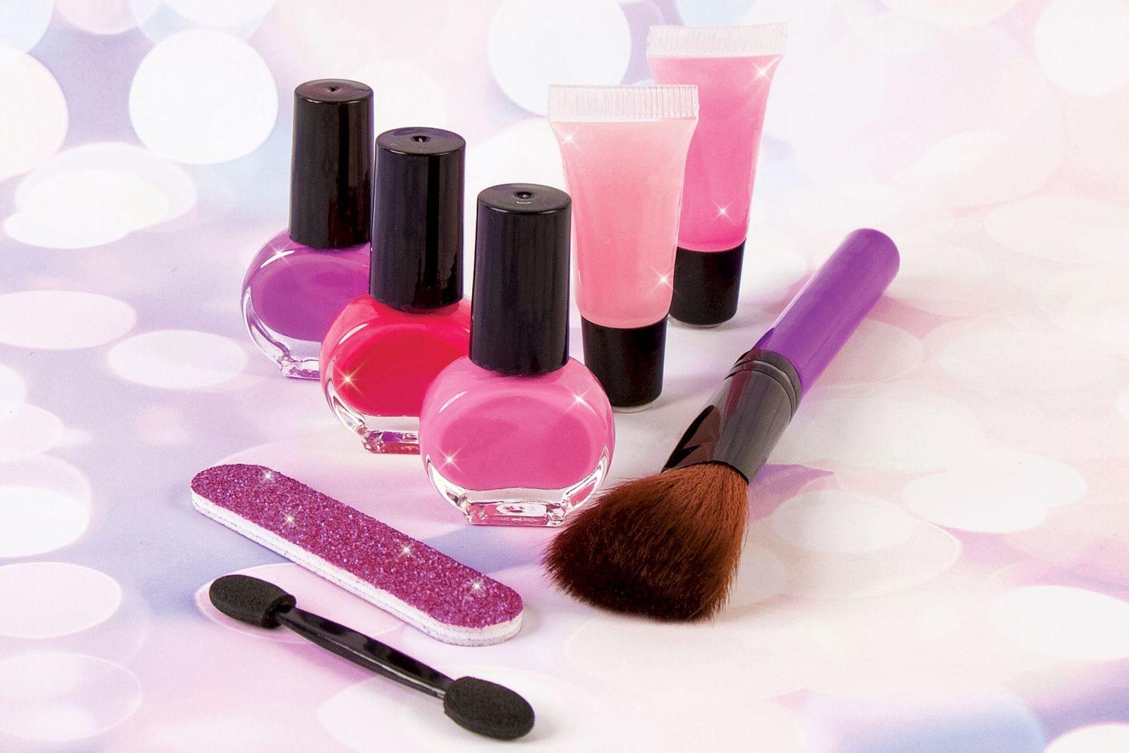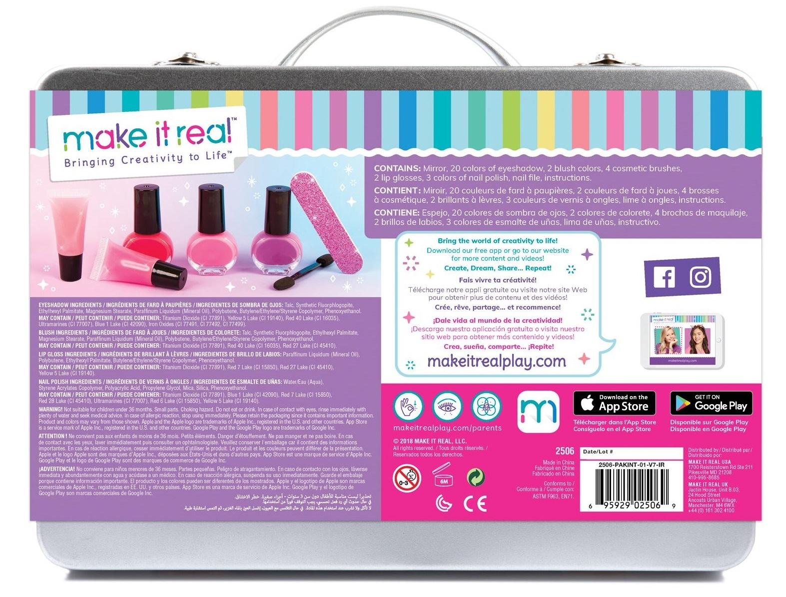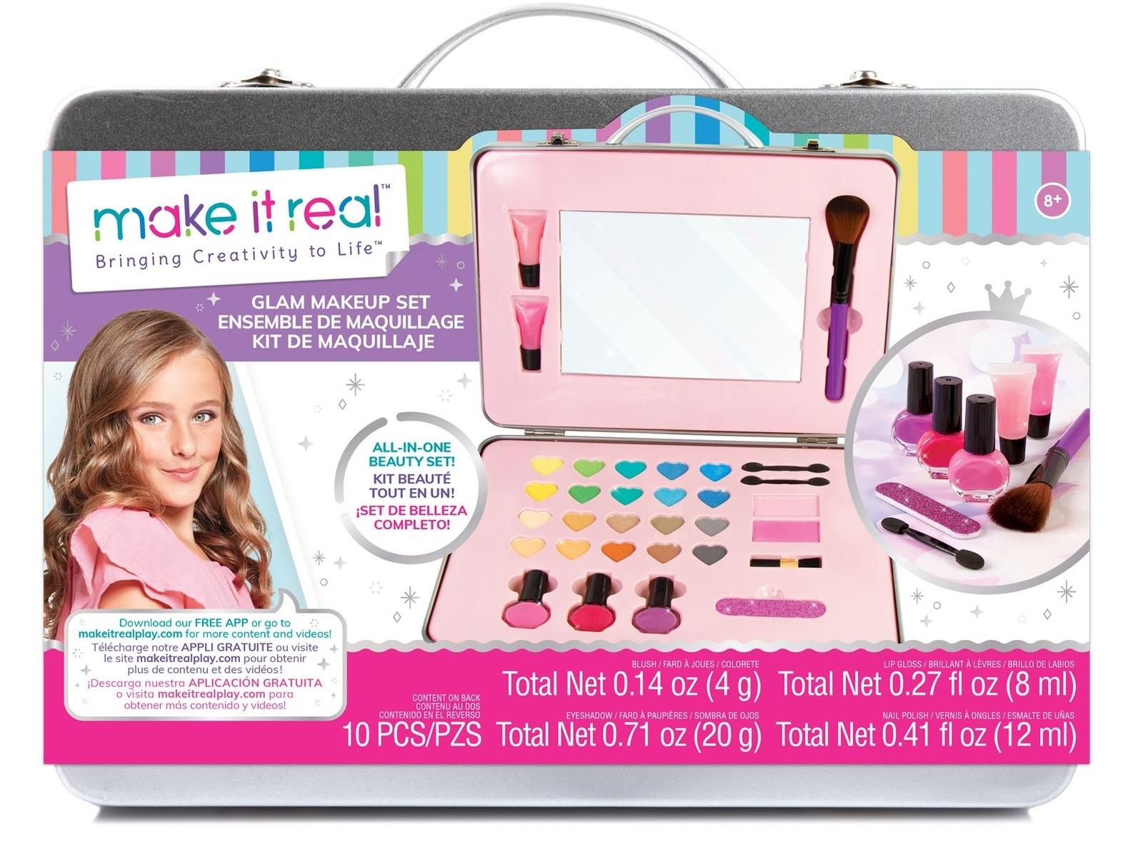 *All-in-one beauty set!*The ultimate deluxe cosmetic set that can keep up with her creativity, and travel with class! With a wide palette of make up accoutrements, she can experiment with color and learn the basics of makeup styling.*Kit Includes:** Mirror* 20 colors of eye shadow* 2 blush colors* 4 cosmetic brushes* 2 lip glosses* 3 colors of nail polish* Nail file* Instructions*Suitable for ages 8 & up*