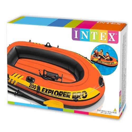 The Explorer Pro 200 inflatable boat makes cruising around the pool fun for two people. Designed for comfort and rigidity with an inflatable I-beam floor, this boat has three air chambers including an inner auxiliary chamber inside the main hull. A grab handle on the bow and an all-around grab line are provided for your convenience, as well as welded oar locks.* 77" x 40" x 13" (196cm x 102cm x 33cm)* Persons Capacity: 2* Weight Capacity: 264 lbs* Quick-fill, fast-deflate Boston valve on main hull chamber* All-around grab line*Oars included*