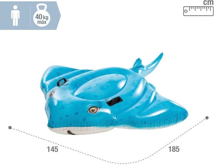 *Intex: Inflatable Ride-On Stingray*Bring under the sea fun to the pool with this fierce stingray, for hours of summer sun.*Features:** Approximate deflated size: 1.85m x 1.45m* Photo real printing* 2 heavy-duty handles; Includes repair patch* Maximum weight limit: 88 lb/40 kg*Suitable for Ages 3–6*_WARNING! Children have drowned in portable swimming pools. Ensure active adult supervision at all times._