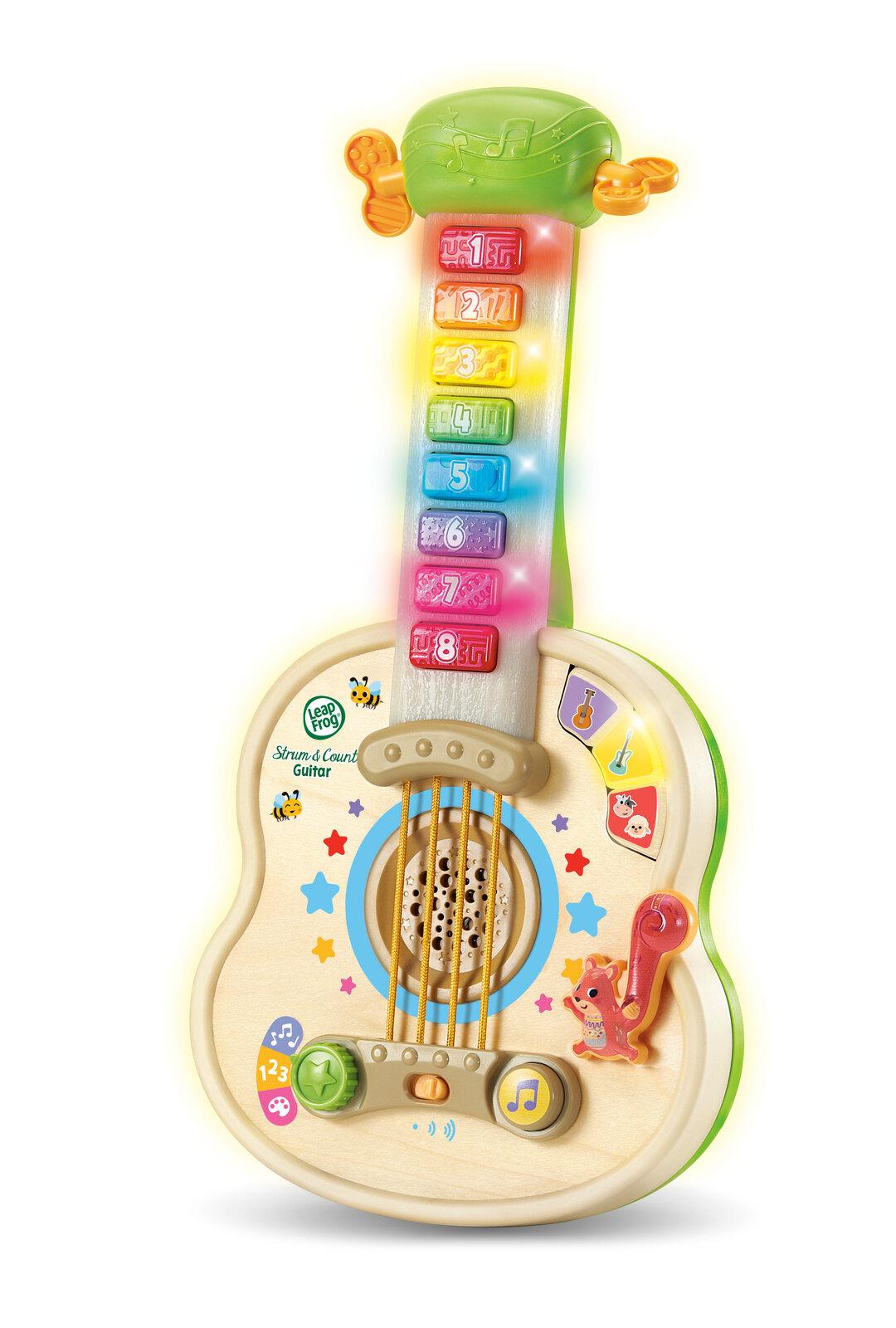 Toddlers can jam with this learning guitar! Play musical games, finish the tune and switch up the instrument sounds while exploring colors and numbers.Strike a chord with this guitar that includes colorful fret buttons, pluckable strings and a whammy bar filled with fun and learning! Little ones can explore core concepts like colors, numbers, opposites and more while jamming with the band. Move the squirrel’s tail to introduce music and games, including strumming along to finish a song.Let creativity shine and freestyle your own tunes! Explore different styles by playing the sounds of acoustic and electric guitars, or switch to playful barnyard animal sounds. Enhance the ambiance with a guitar neck that lights up for a rockin’ rainbow of colors. What a rockstar! The guitar is made with 100% FSC-certified wood that comes from well-managed forests.*Features:** An Octave of Learning – Eight fret keys introduce colors and numbers while encouraging curiosity and helping develop fine motor skills.* Play That Song – Take charge and be the band leader by finishing the melodies or inspire creativity by making your own tunes.* Choose Your Instrument – Keep playtime interesting by discovering how music changes with the sounds of an acoustic or electric guitar, or cute barnyard animals.* Squirrel Whammy Bar – Explore cause and effect by moving the squirrel’s tail to enjoy fun games that explore vocabulary and musical genres.* Light Show – Plucking the strings and pressing the fret buttons light up the guitar neck, adding visual excitement to the jam session.* Realistic Role-Play – Strumming strings, twistable tuning pegs, buttons, knobs and more make this guitar feel just like the real thing!