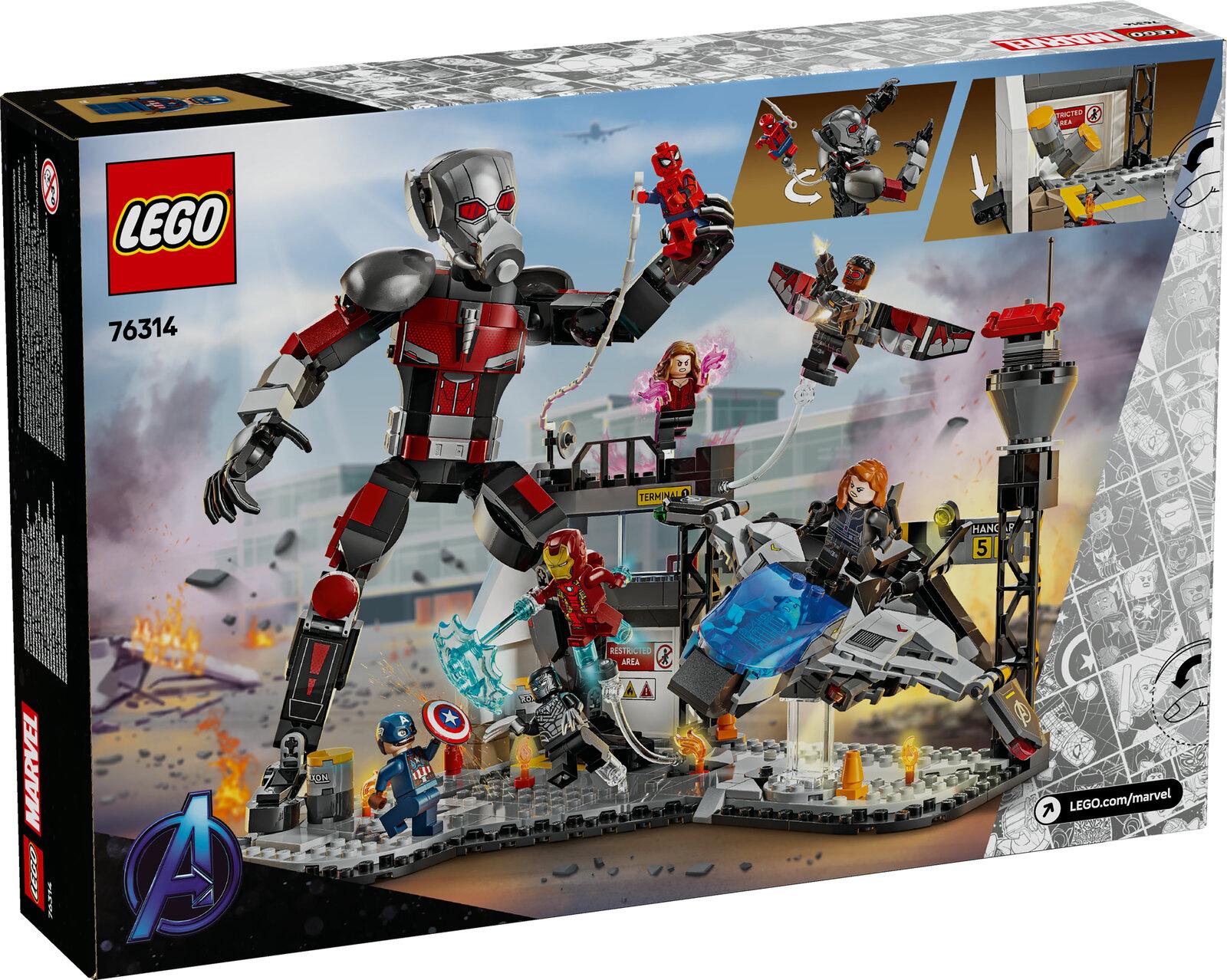 *Captain America: Civil War LEGO Super Hero action*Captain America: Civil War Action Battle (76314) is a detailed, buildable LEGO Marvel toy that makes an epic Super Hero gift for kids aged 10 and over. With 9 LEGO Marvel figures, a Quinjet aircraft and lots of accessories, this buildable LEGO set lets kids recreate favourite movie moments and explore endless imaginative adventures and display possibilities of their own.This buildable playset is based on the airport battle scene from Marvel Studios’ Captain America: Civil War.It includes 8 minifigures – Captain America, Winter Soldier, Wanda, Falcon, Iron Man, Spider-Man, Black Widow and Black Panther – with weapons and accessories, plus a fully jointed Ant-Man standing over 24 cm (9.5 in.) tall. The Quinjet aircraft features foldable wings and an opening cockpit that seats a minifigure pilot. The battle action is further aided by an exploding barrel feature incorporated within the airport scenery. Kids can zoom in and rotate models as they build using the digital LEGO Builder app.*Features:** Put Marvel Studios’ Captain America: Civil War action into kids’ hands* Includes 8 LEGO Marvel minifigures and a large, fully jointed Ant-Man figure* The buildable set recreates the Marvel films’ epic battle at the airport* Contains an explosion feature and a Quinjet airplane with an opening cockpit* LEGO Marvel gift for kids who are fans of building sets and Super Hero action* Kids can zoom in and rotate sets in 3D using the intuitive LEGO Builder app* LEGO Marvel building sets put endless Super Hero adventures into kids’ hands* 736 pieces, with the Ant-Man LEGO figure standing over 24 cm (9.5 in) tall*Specifics:**Item*: 76314*Pieces*: 736*Ages*: 10+