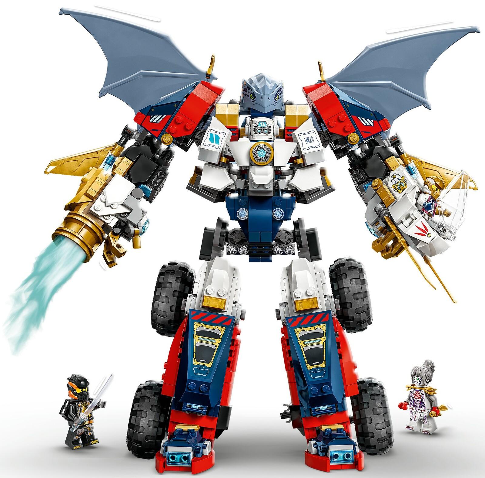 *LEGO NINJAGO 4-in-1 mech toy playset with 6 minifigures*Boys and girls aged 9 and over can enjoy endless play possibilities recreating exciting action from season 3 of the NINJAGO Dragons Rising TV show with Zane’s Ultra Combiner Mech (71834) toy 4-in-1 building set.Kids can play with the stunning large combiner mech, which has posable legs, feet, arms, wrists, fingers and head, dragon wings, plus a cockpit and 2 shooters. They can then separate it into 4 smaller models: a dragon toy with posable features and wings; a jet toy with movable engines and a rotatable cockpit; a car toy with 4 large off-road wheels and 2 opening cockpits, including one with hidden blasters; and a Zane action figure.This ninja playset comes with 6 minifigures so kids can enjoy countless hours of pretend-play battles. Ninjas Sora and Cole and their ally Pixal are armed with cool ninja weapon accessories to take on the villainous trio of Nokt, a Dragonian Warrior and a Dragonian Scout, who each have their own weapon accessories.*Features:*\* A 4-in-1 mech toy for recreating action from season 3 of NINJAGO Dragons Rising\* Zane’s Ultra Combiner Mech has posable features, dragon wings and 2 shooters\* This large NINJAGO mech toy can be separated into 4 smaller ninja models\* 6 minifigures: Sora, Pixal, Cole, Dragonian Warrior, Dragonian Scout and Nokt\* A ninja gift idea for kids aged 9 and over that lets them enjoy imaginative play\* Check out other action toy sets (sold separately) in the LEGO NINJAGO range\* Kids escape into a fantasy world with LEGO NINJAGO sets\* 1,187-piece ninja playset with a mech toy standing over 35 cm (14 in.) tall*Specifics:**Item*: 71834*Pieces*: 1187*Ages*: 9+