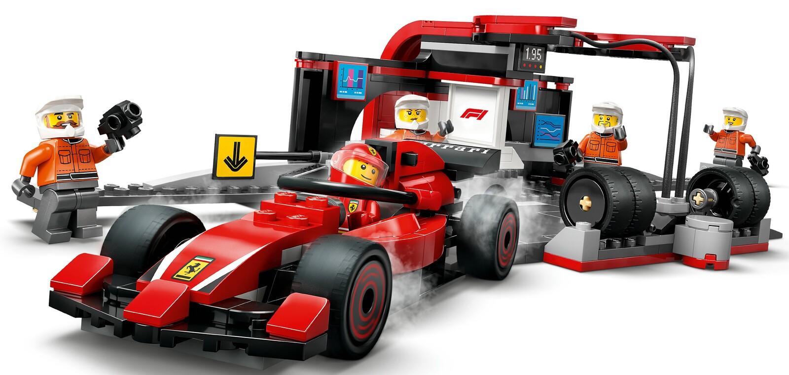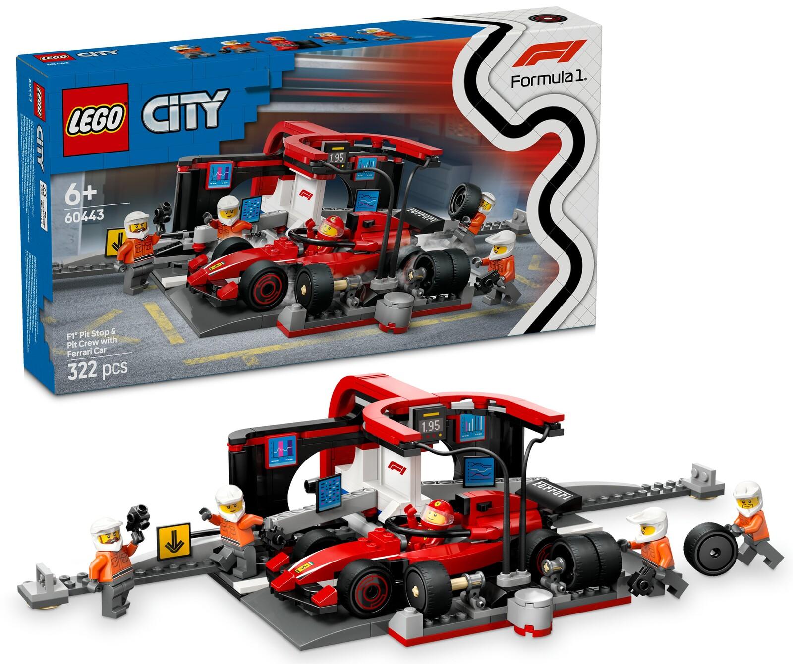*LEGO City F1 Ferrari pit stop race car playset*Bring the thrill of the racetrack to kids’ play with the LEGO City F1 Pit Stop & Pit Crew with Ferrari Car (60443) vehicle toy building set for ages 6 and over. This set includes everything kids need for lightning-fast pit stops, including fresh slicks, wheel guns and a crew who move into position at the flick of a switch for turbocharged tyre changes. Complete with a toy Formula 1 Ferrari race car, plus driver and 4 pit crew minifigures, this playset is fine-tuned for young racing enthusiasts.This LEGO F1 model includes a step-by-step printed construction guide and digital instructions in the LEGO Builder app. Here, kids can zoom in and rotate models in 3D, track their progress as they build, and explore and save other playsets. Capture the thrill of the track with this LEGO City F1 toy vehicle set – a perfect Christmas or birthday gift for young race fans. Discover the dynamic range of F1-themed LEGO building kits (sold separately) for kids and adults.*Features:** LEGO City F1 Pit Stop & Pit Crew with Ferrari Car vehicle toy for ages 6 plus* F1 pit stop set with a Ferrari toy car, plus driver and 4 pit crew minifigures* Kids press a lever on the F1 model pit box to move the pit crew into position* F1 LEGO minifigure accessories include tools, fresh slicks and wheel guns* Give this LEGO car set as a fun Christmas or birthday gift for kids aged 6 and over* This miniature F1 pit stop toy features 3D instructions in the LEGO Builder app* Discover the range of LEGO F1 sets (sold separately) for the whole family* The pit box model in this 322-piece LEGO City set is over 14 cm (5.5 in.) wide*Specifics:**Item*: 60443*Pieces*: 322*Ages*: 6+