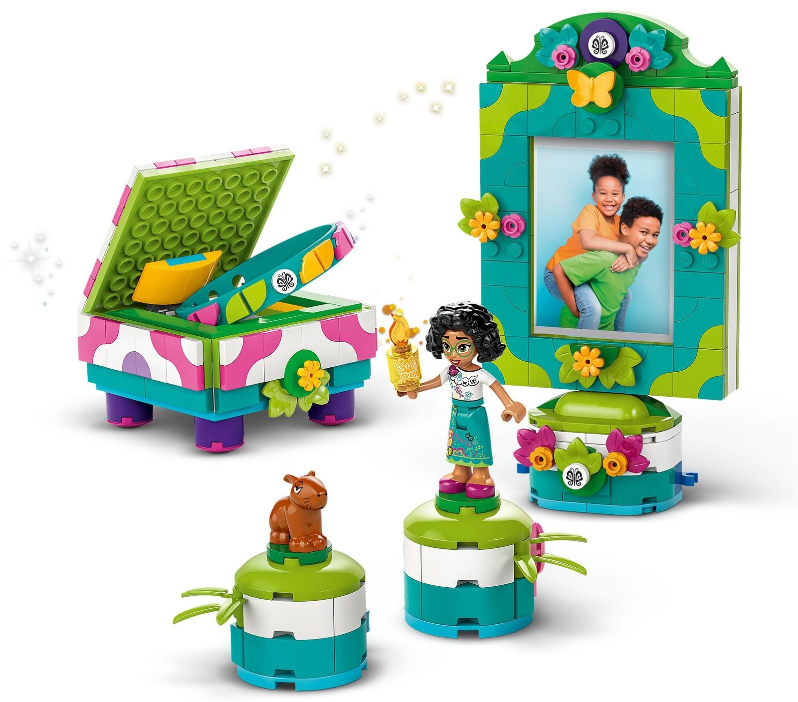 *Spark creativity with a LEGO® ǀ Disney Encanto buildable toy*Appeal to fans and kids aged 6+ who love Disney films with this creative LEGO® ǀ Disney Encanto Mirabel’s Photo Frame and Jewellery Box (43239) buildable toy. Featuring a jewellery box with room for the included bracelet, plus a photo frame and stand with extra clips for small photos and 2 spots for the Mirabel LEGO ǀ Disney mini-doll figure character and LEGO ǀ Disney capybara figure. This colourful, multi-piece Disney construction set is packed with features and accessories to inspire creative kids.It makes a fun gift for girls, boys and fans of art and design who are looking for a new creative outlet that encourages redesign and decorating. Builders also enjoy an easy and intuitive building experience with the LEGO Builder app. They can zoom in and rotate models in 3D, save sets and track their progress. The set is made for short, everyday play sessions and can be added to other LEGO sets as well as LEGO ǀ Disney construction toys in the series (each set sold separately) to expand play.*Features:** Creative fun with a LEGO® ǀ Disney Encanto buildable set for play and display* Jewellery box, photo frame, bracelet and a LEGO® ǀ Disney Encanto mini-doll figure* A building set that kick-starts kids’ imagination with fun film details* Designed to show off kids’ creativity with items they can decorate and use* A fun, everyday Disney gift idea for girls and boys aged 6 and over* Expand the fun by adding it to other sets (sold separately) in the series* This LEGO® ǀ Disney construction set helps kids explore passions through fun* 334-piece set includes a photo frame measuring over 15 cm (6 in.) high*Specifics**Item*: 43239*Pieces*: 334*Ages*: 6+