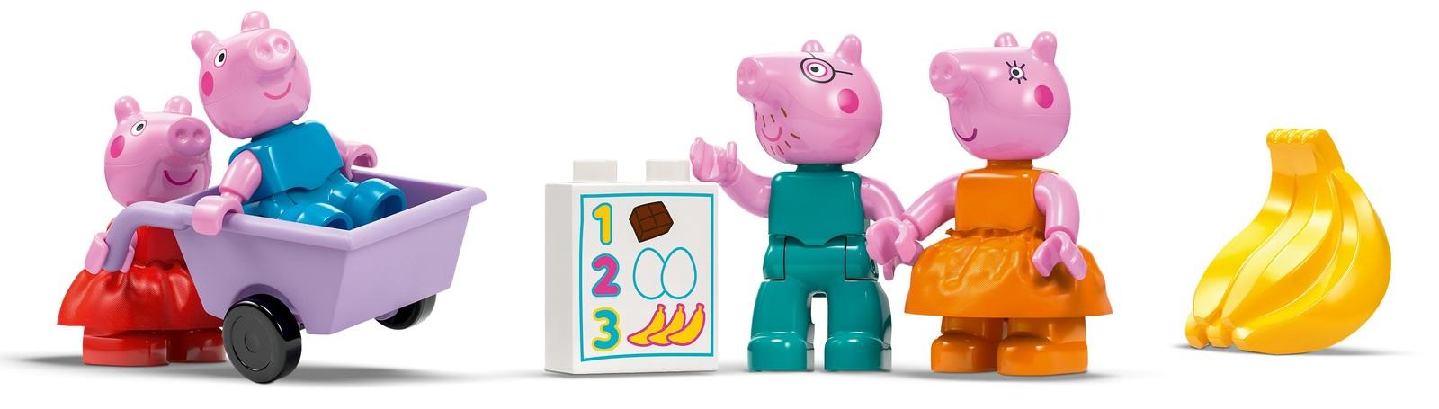*LEGO DUPLO Peppa Pig shop toy for toddlers*Help girls and boys aged 2 and over role-play a trip to the shop with the LEGO DUPLO Peppa Pig Supermarket (10434) toy. Preschoolers become one of the family as they drive to buy food in the iconic red car from the show. This build-and-rebuild toy for toddlers is packed with accessories to spark creative role play. With 4 figures – a Peppa Pig toy, George, Mummy Pig and Daddy Pig – toddlers can pretend to be both the parents and the children. Preschoolers will recognise items from a real-world supermarket, such as the self-checkout, shopping trolley and chiller cabinet.This LEGO DUPLO Peppa Pig learning toy for preschoolers helps kids develop skills as they think logically while playing out shopping trips inspired by the TV show. Families can also explore feelings through play. This relatable scene will spark conversations between grown-ups and toddlers about behaviours when in the shop and – importantly – who gets to push the trolley!*Features:** Toddlers enjoy shopping role play with the Peppa Pig supermarket toy* Comes with 4 figures – George, Mummy, Daddy and a Peppa Pig toy* Build-and-rebuild toy includes lots of recognisable supermarket features* Toddlers finesse fine motor skills as they open the chiller cabinet door* Special-occasion gift idea for preschoolers who love Peppa Pig toys* This creative toy develops fine motor skills and self-expression* LEGO DUPLO Peppa Pig toys guarantee a safe play experience* This 70-piece set measures over 21 cm (8.5 in.) high and 57 cm (22 in.) wide*Specifics**Item*: 10434*Pieces*: 70*Ages*: 2+