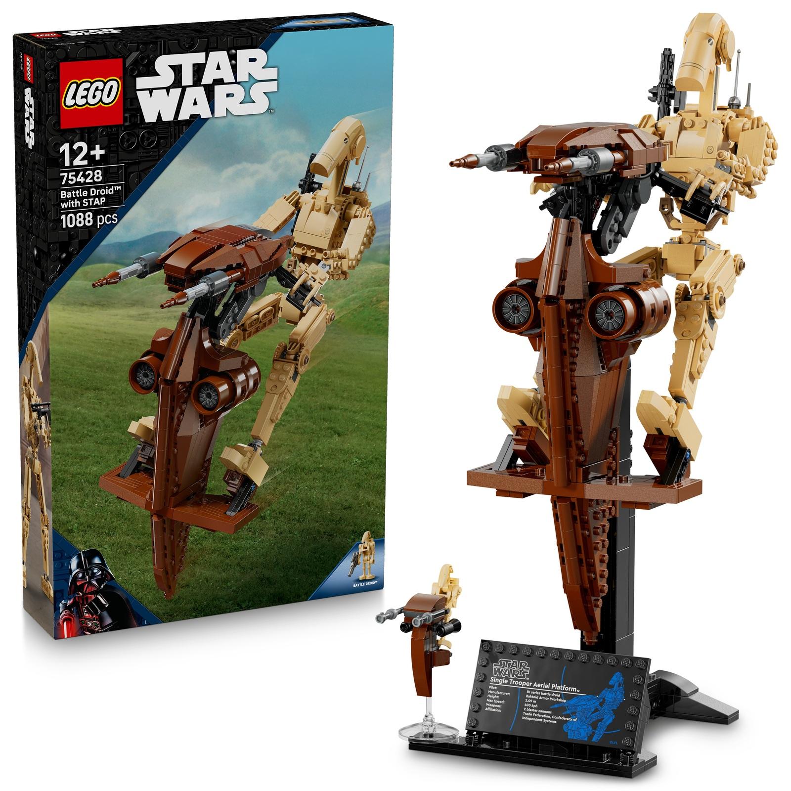 *Fun build-and-display set for Star Wars fans*Put a young fan’s passion for Star Wars on full display with this Battle Droid with STAP building toy for kids (75428). A cool LEGO Star Wars gift for boys, girls and any fans aged 12 years old and over, this dynamic build-and-display model makes impressive desk decor. Place the LEGO brick-built posable figure of a Battle Droid riding its STAP speeder on the display stand or lift the character and STAP off the stand for swooshing action. The Battle Droid can also stand on its own, with its brick-built blaster attached to its back or held in its hands.This LEGO Star Wars set also includes a Battle Droid LEGO figure with a STAP, which can be placed next to the stand’s information plaque to complete a striking display. The set comes with step-by-step instructions. Check out the LEGO Builder app for intuitive, 3D zoom and rotate viewing tools to enhance the creative experience. Set contains 1,088 pieces.*Features:** LEGO Star Wars Battle Droid with STAP build-and-display model* A buildable, posable Battle Droid figure, STAP speeder and display stand* This customisable building toy for kids makes a fun display* A standard-size Battle Droid LEGO figure on a STAP speeder, plus an info plaque* LEGO Star Wars gift for boys, girls and any fans aged 12 and over* Download the LEGO Builder app for intuitive 3D building instructions* The LEGO Star Wars range has building sets (sold separately) for all ages* The Battle Droid buildable figure on the STAP measures over 38 cm (15 in.) high*Specifics:**Item*: 75428*Pieces*: 1088*Ages*: 12+