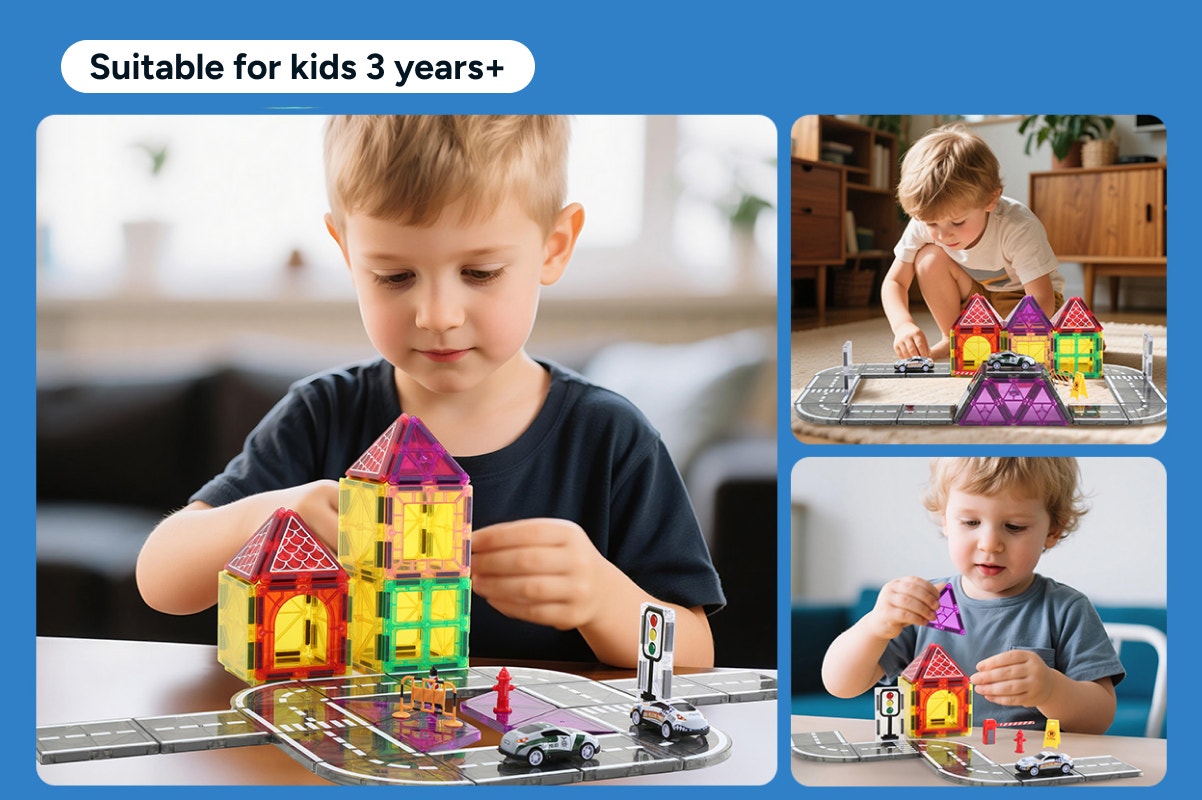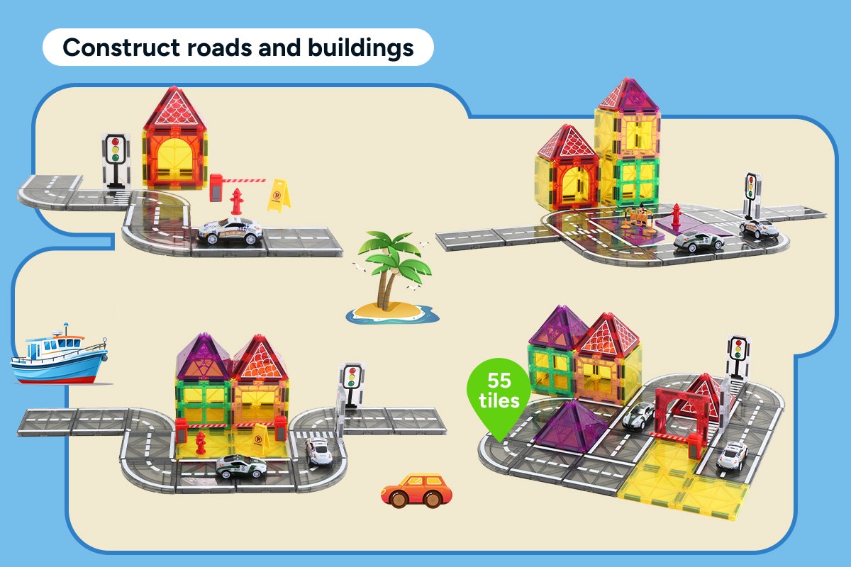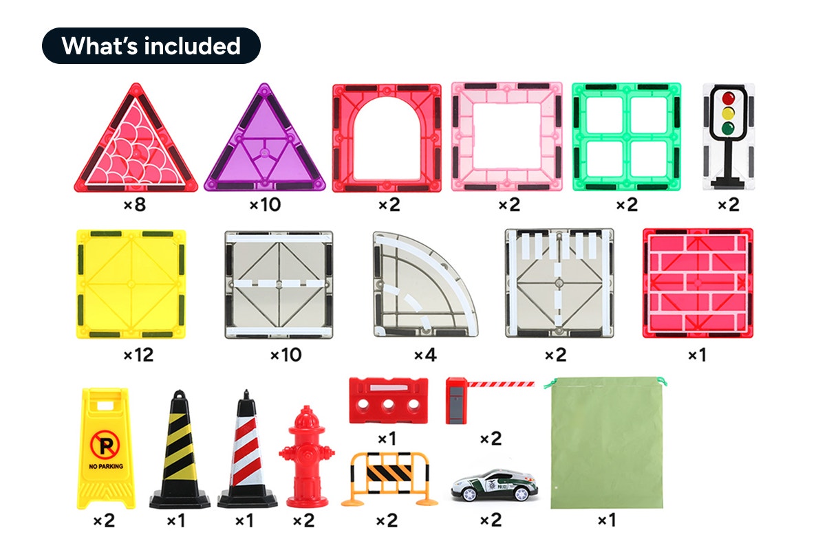 p{font-weight:bold;font-size:1.2em}. Spark your child's imagination and teach practical road skills with the 69 Piece Road Magnetic Tile Set - a fun, educational and creative way to build and learn.* *53 magnetic tiles.* Create roads, buildings and traffic systems with ease.* *13 traffic accessories.* Teach basic traffic rules in a hands-on way.* *2 cars included.* Drive through an imaginative world they’ve built themselves.* *Child-safe materials.* Made to be durable, non-toxic and kid-friendly.* *Supports learning.* Encourages STEM thinking, creativity and storytelling.p{font-weight:bold;font-size:1.2em}. Creative constructive playWith 53 magnetic tiles in various shapes and sizes, kids can build roads, intersections and buildings just the way they imagine. It’s a fun way to support problem-solving and spatial thinking, while letting their creativity run wild.p{font-weight:bold;font-size:1.2em}. A fun way to learn about trafficThe 13 included traffic items - like boom gates, hydrants and traffic lights - give children the tools to act out real-life driving scenarios. It’s an engaging way to introduce traffic rules and help develop a sense of road safety through play.p{font-weight:bold;font-size:1.2em}. Designed for safetyMade from non-toxic, child-safe materials, this set is built for hands-on use. The pieces are easy to grip and connect, and the 2 included cars make sure kids can enjoy interactive driving adventures straight out of the box.