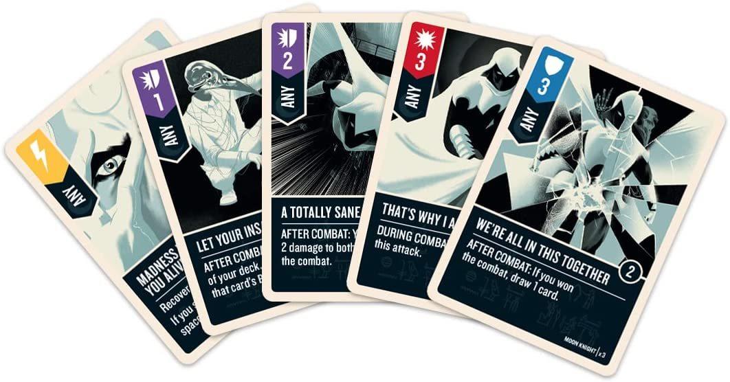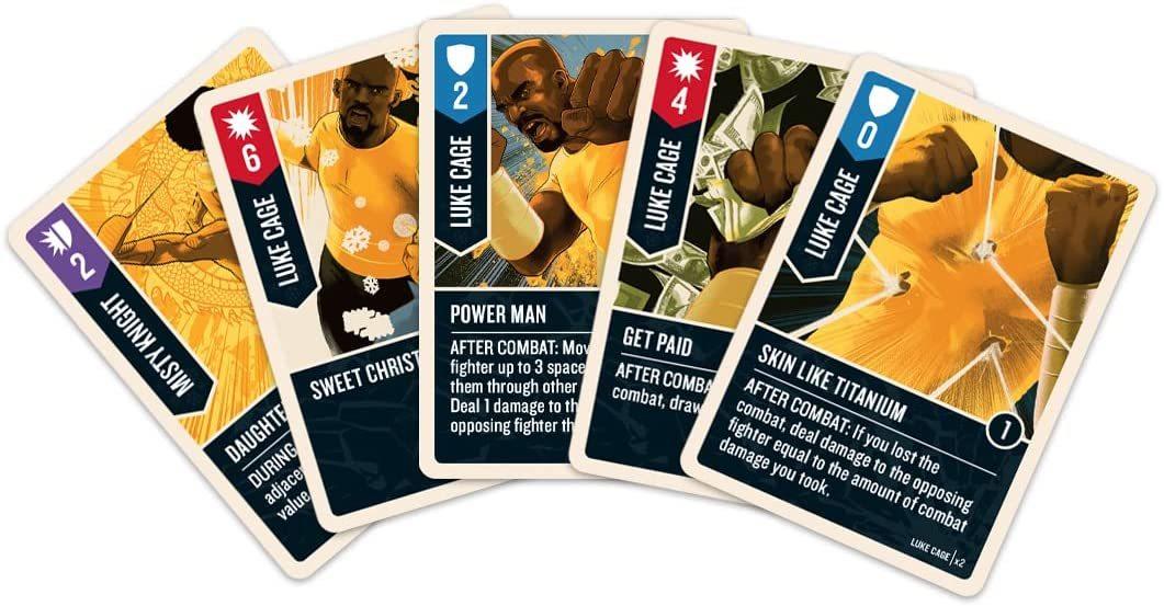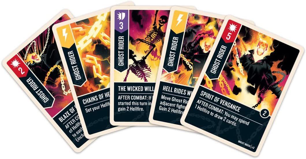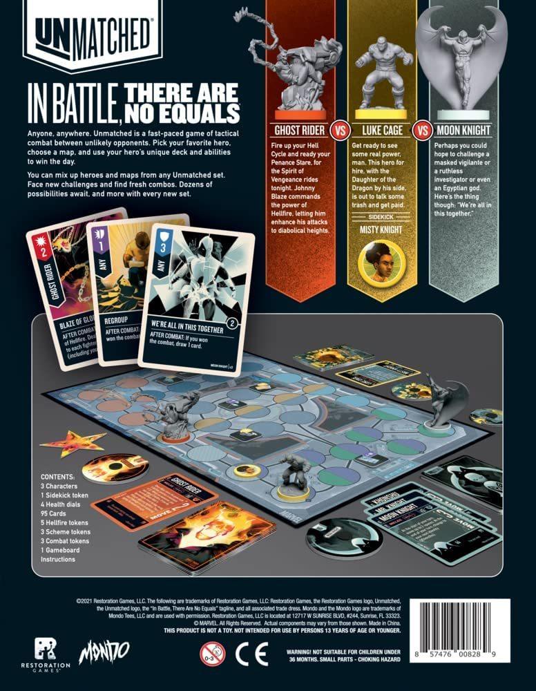 When it comes to *Unmatched*… Make Mine Marvel!*Unmatched* is the critically acclaimed, best-selling game of tactical combat between unlikely opponents.Redemption Row brings three of Marvel’s most tortured heroes into the arena:* Moon Knight shifts through three identities, leveraging the power of each.* Ghost Rider channels Hellfire to further fuel his deck.* When you come at Luke Cage, you best pack a punch if you hope to get through his titanium-like skin.They’ll duke it out on the Raft battle map, featuring item tokens that provide fighters with potent effects.*Features:** players: 2–3* Playtime: 20–40* Ages: 14+*Contents:** 1 double-sided game board* 3 characters* 1 sidekick token* 4 health dials* 95 cards* 5 hellfire tokens* 3 scheme tokens* 3 combat tokens