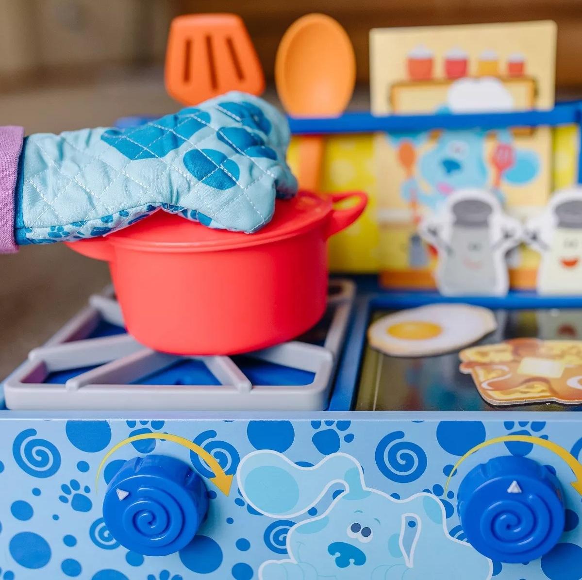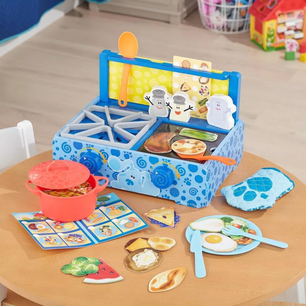 *Blues Clues & You! Wooden Cooking Play Set*Join Blue and friends to prepare pretend-play meals on this generously sized sturdy wooden stovetop! The Blue’s Clues & You! play set features a reversible griddle and sink, knobs that click and turn to adjust the burner “flame,” and a built-in storage rack. Kids three and older will love using the durable pot with lid, spatula, and spoon to “cook” 25 double-sided cardstock food pieces and serve countless make-believe meal combinations! Pieces store on rack and inside. Blue’s Clues & You! promotes kindergarten-readiness, inspiring confidence, empowerment, and kindness in preschoolers as they develop their problem-solving, social, and developmental skills through play.*Features:** Join Blue and her friends to cook up imaginative play food fun with a wooden stovetop, utensils, and wooden Blue’s Clues & You! character play pieces* 42-piece play set includes 25 double-sided cardstock food pieces, durable pot with lid, plate, utensils, spatula, serving spoon, paw print-shaped oven mitt, wooden Mr. Salt, Mrs. Pepper, and Slippery Soap, cookbook activity card, and reusable grocery list* Reversible grill top and sink; knobs turn and click; pieces store in built-in rack and under stovetop for easy cleanup* Blue’s Clues & You! promotes kindergarten-readiness, inspiring confidence, empowerment, and kindness in preschoolers as they develop their problem-solving, social, and developmental skills through play*For Ages 3 & up*