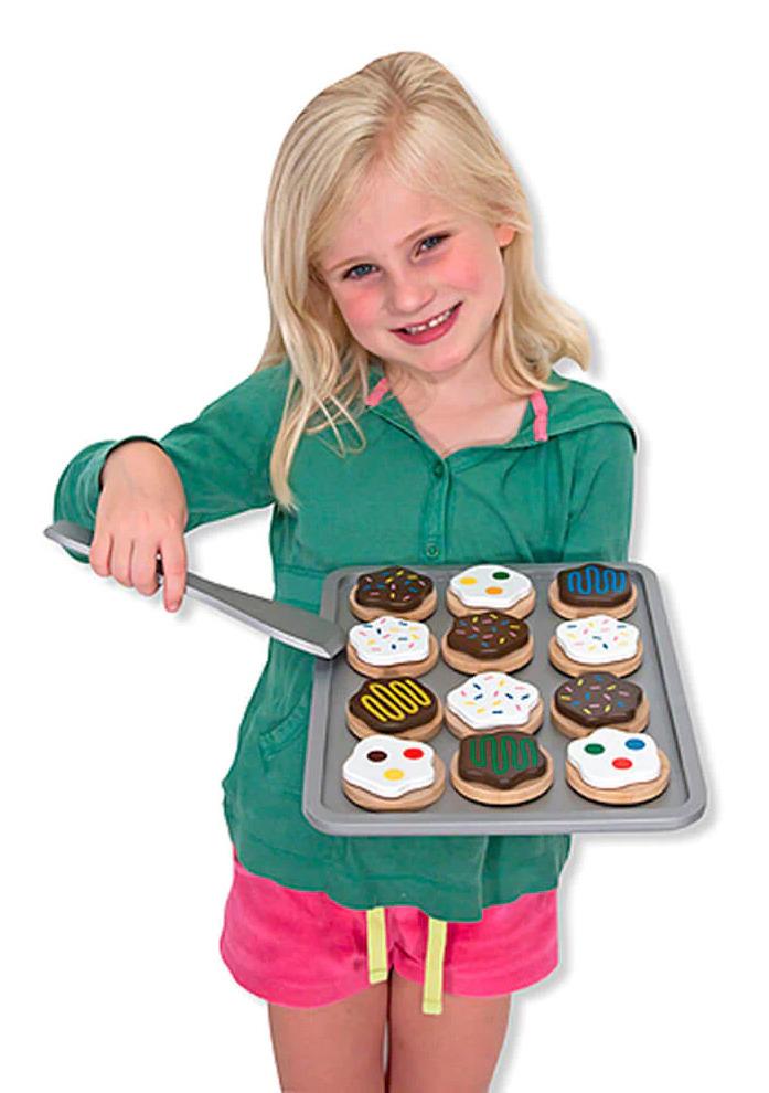 *Slice and “bake” a dozen wooden cookies for a sweet playtime treat!*This colourful wooden set includes 12 wooden, sliceable cookies and 12 toppings, wooden knife, spatula, cookie sheet and a kitchen mitt for safe, “low-calorie” play! The cookies store in a durable dough tube.*Features:** Includes 12 sliceable cookies, 12 toppings, knife, spatula, cookie sheet, and kitchen mitt* High-quality materials designed for long-lasting play and safety* A “sweet” introduction to pretend kitchen play* Cookies store in a durable dough tube* Dimensions: 26.7cm x 34.5cm x 8.3cm Packaged.*Suitable for ages 3 & up*