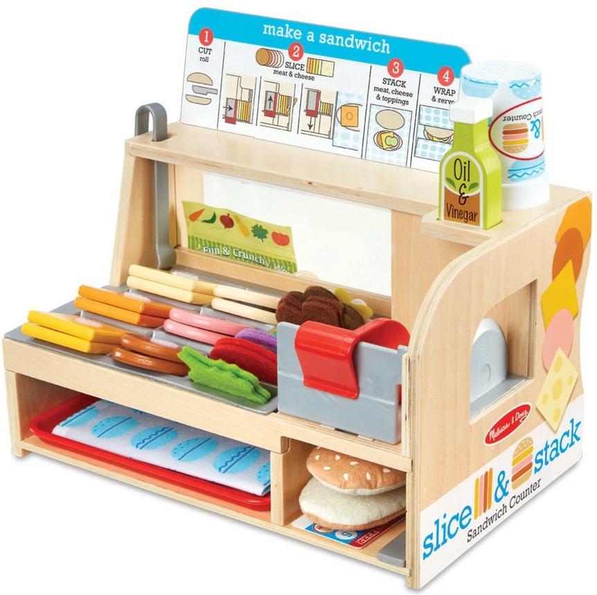 *Create piled-high sandwiches, made to order with this wooden sandwich counter play set with all the fixin's!*The sturdy wooden deli counter includes a play meat and cheese slicer for the wooden play food, and felt sandwich roll and toppings to create sandwiches ordered from the menu. There is a wooden dressing bottle, play snacks, and a cup with drink insert to round out meals that customers can pay for with the included play money! An illustrated guide helps with sandwich prep and shows kids how to use the slicer.All 52 pieces store in the sandwich counter for easy cleanup. It's a deliciously fun way to encourage counting, sorting, and fine motor skills, as well as imaginative play and storytelling.*Features:** Create piled-high, deli-fresh pretend play sandwiches with this 52-piece sandwich counter* Counter includes a slicer, sign with menu on one side and sandwich prep instructions* Helps encourage counting, sorting, and fine motor skills, imaginative play and storytelling* Makes a great gift for preschoolers, ages 3 to 6, for hands-on, screen-free play*Suitable for ages 3 years & up*