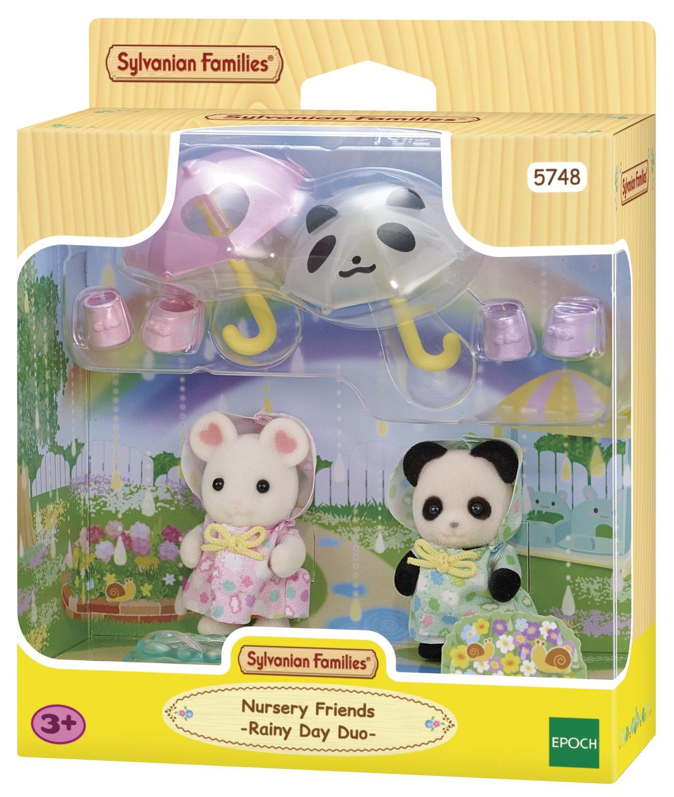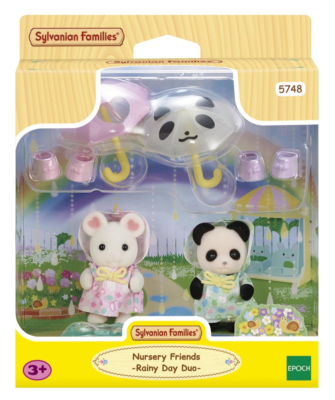 Marshmallow Mouse baby Albert and Pookie Panda baby Angela are all dressed ready to splash in the puddles! Nursery Friends, Rainy Day Duo, set is the perfect addition to any nursery playset!It contains two babies, Angela Pookie & Albert Marshmallow. This set comes with cute little umbrellas, wellies and even a puddle, perfect for rainy day play. The umbrellas fit in the babies’ hands & the wellies can be worn by any Sylvanian baby.Combine with Sunny Castle Nursery, Rainbow Fun Nursery Bus, Nursery Swing, Nursery Sandbox & Pool and Flora Rabbit Family *(sold separately)* for even more fun.*Suitable for ages 3 & up*