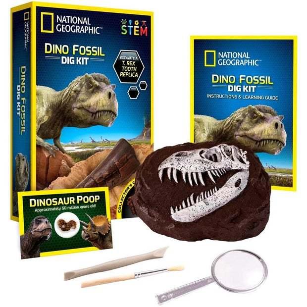 *Let your kids journey to the prehistoric era!*The Dinosaur Dig Kit from National Geographic gives little palaeontologist the opportunity to discover three genuine dinosaur fossils. Dig up a dinosaur bone, mosasaur tooth, and dinosaur poop for your rock collection. This kit is a real educational adventure for kids as it features interesting facts and full-color learning guide. They will have hands-on exploration in this interactive archaeological dig. Let them experience the thrill of discovery.This science kit includes: One digging brick containing 3 ancient fossils (dino bone, mosasaur tooth, dino poop), archeological digging tools, full-color learning guide, and magnifying glass.