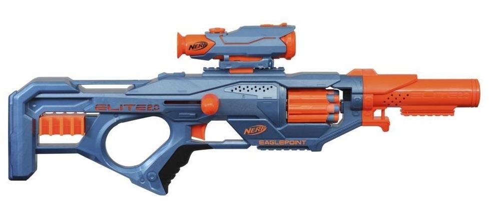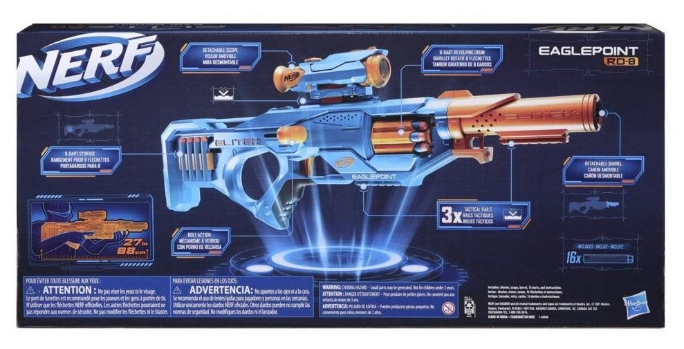 *Customize the Nerf Elite 2.0 Eaglepoint RD-8 blaster for any mission!*This Nerf dart blaster includes an attachable scope and attachable barrel so you can create different blaster styles as you gear up for Nerf games. Go lean and mean with the core blaster, add the scope to line up your targets, add the barrel for distance targeting – you're ready for whatever the battle brings with the Eaglepoint RD-8 blaster. The revolving drum has an 8-dart capacity. Fire 8 darts in a row, then reload fast from the onboard dart storage that holds 8 darts.This Nerf Elite 2.0 blaster comes with 16 Official Nerf Elite darts – 8 darts to load into the drum, and 8 darts to store on the blaster. Take aim and send the darts flying through the air up to 90 feet (27) meters. It has 3 tactical rails to add Nerf accessories (each sold separately, subject to availability).*Features:** Nerf Elite 2.0 Eaglepoint RD-8 blaster includes a detachable scope and barrel* Use the tactical rails to create different blaster styles for any mission.* Fire 8 darts in a row up to 90 feet away (27 meters) from the 8-dart revolving drum* Includes 16 Official Nerf Elite foam darts, built-in storage for 8 darts* 3 tactical rails for Nerf gear (sold separately)* Suitable for ages 8 & up*Please Note:*_Caution: Do not aim at eyes or face.__To Avoid Injury: Use only darts designed for this product.__Warning: Choking Hazard: Small parts may be generated.__Not for children under 3 years._