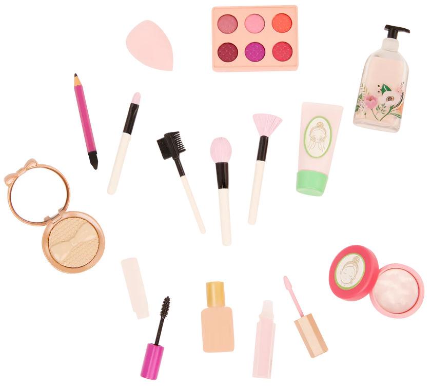 *Our Generation: Accessory – Fabulous Fun Vanity Set*Light up imagination and create stunning styles with the Our Generation Fabulous Fun Vanity Set for 46cm dolls! This charming vanity table and chair set are designed in pretty pink with golden details. Plus, it comes with pretend make-up accessories like a tube of mascara, lip gloss, an eyeliner pencil, a compact, an eyeshadow tray, foundation, lotion, a jar of eye cream, and a tube of cream for kids to give their dolls stylish makeovers. Plus, kids can pretend to apply the make-up with 3 brushes, an eyebrow comb, and a make-up sponge.The vanity table features a real mirror with plenty of counter space, a storage compartment, and a pull-out drawer to neatly store and display all items. And it's perfectly sized to turn playrooms and doll bedrooms into a dream glamor station. Compatible with most 46cm dolls and accessories. Our Generation accessories make a great gift for kids ages 3+ (small parts), encouraging them to create their own unique stories. Our Generation dolls sold separately.*Features:** 17-pc Doll Vanity Table & Chair Set: Light up imagination and create stunning styles with the Our Generation Fabulous Fun vanity set for 46 cm dolls!* Filled with Glam: The vanity table features a real mirror with plenty of counter space, a storage compartment, and a pull-out drawer to neatly sort and display the pretend make-up accessories.* Includes: Pink vanity table, chair, a tube of mascara with brush, lip gloss with brush, 3 brushes, eyebrow comb, eyeliner pencil, compact, eyeshadow tray, foundation, lotion, a jar of eye cream with lid, tube of cream and a make-up sponge.* Mix & Match: Compatible with most 46 cm dolls, doll furniture, and accessories.* Accessory Set Only: Dolls sold separately.*Suitable for Ages 3+*
