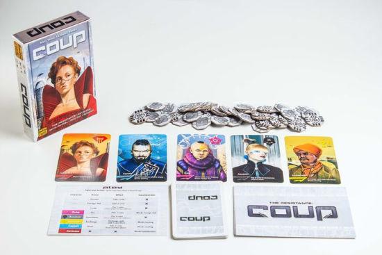 *Everything you need in one small box!*In the not too distant future, The government is run for profit by a new “royal class” Of multinational CEOs. Their greed and absolute control of the economy has reduced all but a privileged few to lives of poverty and Desperation. Out of the oppressed masses rose The Resistance, an underground organization focused on overthrowing these powerful rulers. The Valiant efforts of the resistance have created Discord, intrigue and weakness in the political courts of the nouveau royal, bringing the government to the brink of collapse. But for you, a powerful government official, this is your opportunity to manipulate, bribe and bluff your way into absolute power. To be successful, you must destroy the influence of your rivals and drive them into Exile. In these turbulent times, there is only room for one to survive.You are head of a family in an Italian city-state, a city run by a weak and corrupt court. You need to manipulate, bluff and bribe your way to power. Your object is to destroy the influence of all the other families, forcing them into exile. Only one family will survive…In Coup, you want to be the last player with influence in the game, with influence being represented by face-down character cards in your playing area.*Simple enough that anyone can play. Only the most cunning player will win.*Knowing when to lay low, and when to call a bluff will lead to victory!*Coup – a fast, fun, bluffing party in a box!*Think you know your when your friends are bluffing? Think again!Coup is exactly what you want in party game – a small box, learn in minutes, and games that are over in ten. Play once to warm up the crowd, or over and over to get a read on your friend's “tells”. The more you play, the deeper the strategies are!*Yes, your friends will like this!*Coup can be played by as few as 2 players, or up to 6!Learning how to play is super simple. Get two cards, take one action each turn. Last player standing wins!The only question they are going to ask is if they can play again.*Five roles, endless fun** Captain – Steal from the rich* Assassin – Eliminate your foes* Ambassador – Gather intel* Duke – Build your coffers* Contessa – Guard your influence*Play the cards you were dealt – or bluff your way to victory!**The Dice Tower Seal of Approval is a trademark of The Dice Tower, LLC and is used with permission.*