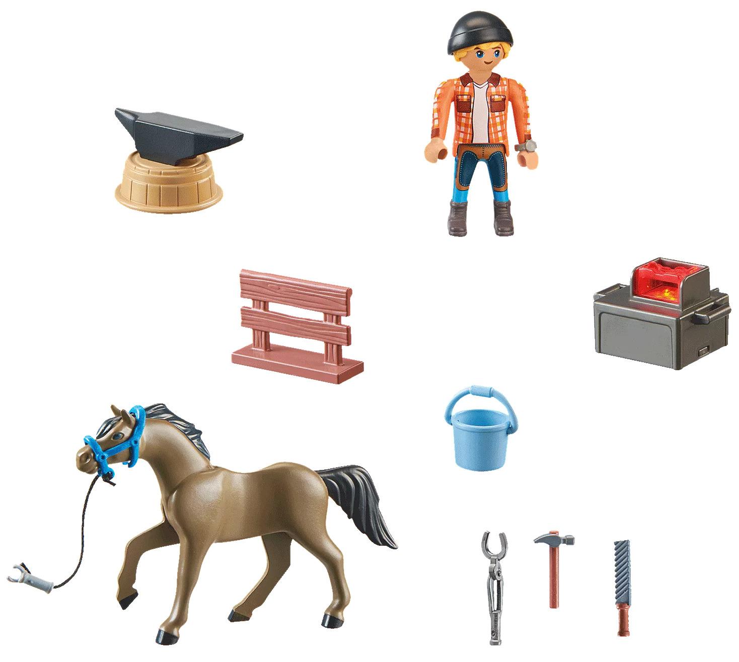 *Playmobil: Farrier Ben & Achilles (71357)*Ben is a farrier intern at Waterfall Ranch and always has an anvil, tongs and hammer handy. He checks and cleans the hooves before lighting the embers of the forge to get everything ready for shoeing. The particular horseshoes and horseshoe nails are custom made for each animal. It's not always easy, but by the end of the day, Ben has fitted Waterfall's horses with new horseshoes. His mustang stallion Achilles, whom Ben tied to the paddock for shoeing, now trusts him blindly.Fun Fact: Waterfall's pre­vious farrier, who rarely stops by the ranch anymore due to age, has placed Achilles in Ben's care.The center of the versatile, new horse world from PLAYMOBIL is the picturesque Waterfall Ranch. There, the five best friends Amelia, Isabella, Zoe, Ellie and Ben spend every free minute together with their horses. They take care of their four-legged darlings and experience varied adventures around riding training and horse care. The perfect gift for any occasion for horse fans aged 4 and up.*Contents:** Figures: 1 farrier;* Animals: 1 horse;* Accessories: 1 cap, 1 halter, 1 cord with handle, 1 fence, 1 anvil, 1 horseshoe tongs, 1 hammer, 1 file, 1 bucket, 1 forge*Suitable for Ages 4+*