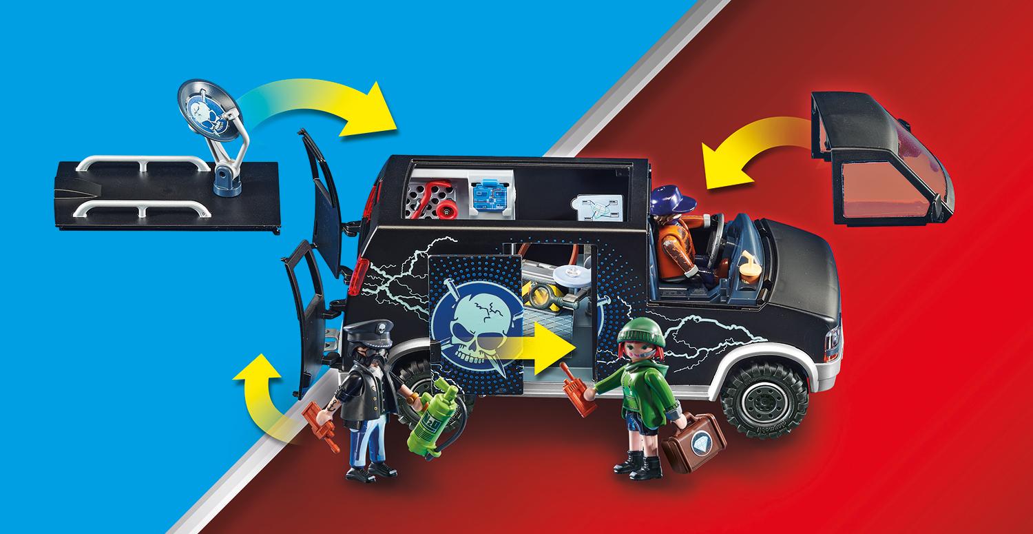 *Unmask the number plates by rubbing them!*Equipped with a grappling hook projectile, the helicopter takes off in pursuit of the criminal's camouflaged escape vehicle.The gangster trio has been planning the jewel robbery meticulously for weeks. Their black van with skull pattern is a mobile burglary centre with computer and laboratory. On the shelf wall there is room for crowbars and glass cutters.The gangster boss has studied the blueprints of the museum in detail and the break-in worked out perfectly. Now the diamonds are checked for purity under a magnifying glass. They are stones of the best quality. Just as the burglars are toasting their successful coup with champagne, a helicopter sound can be heard.The thieves set off quickly, but the pilot stays close on their heels. With a loud bang the grappling hook hits the rear of the van and stops the vehicle. The thieves could not enjoy their prey for long.*Features:** Getaway Spotted Van – Police in Chase* The rear doors of the van can be opened,* The roof is removable and* The number plates can be changed by friction.*Set Includes:** 1 policeman, 3 crooks; 1 getaway vehicle equipped with seating, monitor,* perforated wall and satellite dish, 1 police helicopter, grappling hook, bolt gun bullet,* 1 sack, 1 suitcase, 1 box with handle, 2 sticks of dynamite, 1 bottle, 2 drinking cups,* 4 bolt bullets, 1 fire extinguisher, 1 magnifying glass device, 1 diamond spiking device,* 1 computer, 1 grappling hook with rope, 1 camera, 3 sets of playing cards,* 3 monitor mission boards, 1 pistol, 2 radios, 1 rifle, 1 MP3 player, 1 pair of handcuffs,* 1 crowbar, 1 pair of binoculars, 1 tool, 1 flashlight, 1 glass cutter, 10 diamonds,* 1 police helmet with microphone, 3 caps, 3 wristwatches, 1 pair of arm cuffs, 1 holster*Suitable for ages 4 years and up*