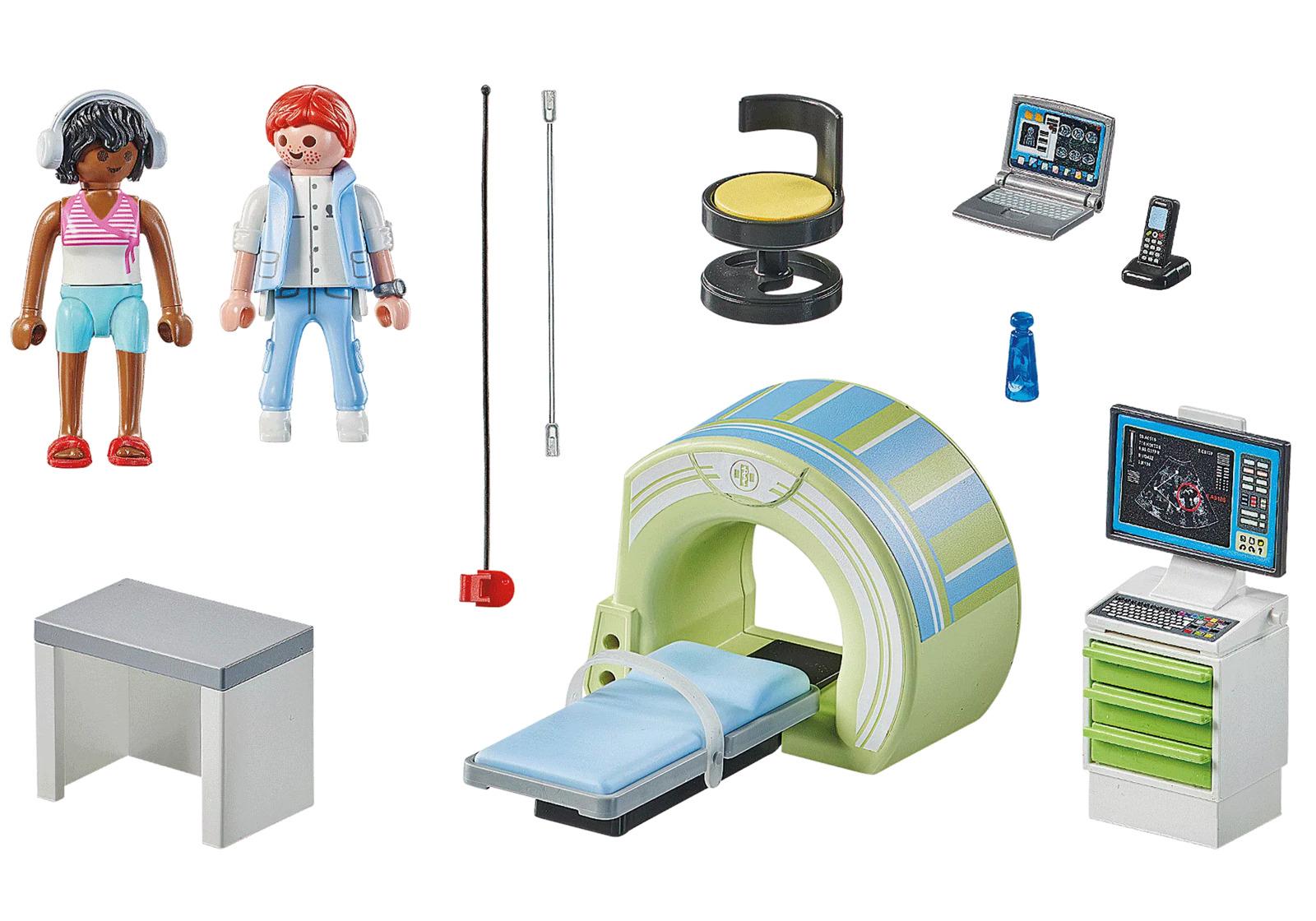 *Playmobil: MRI with Patient (71618)*For treatment at the radiologist. Modern PLAYMOBIL doctor playset featuring two PLAYMOBIL figures and many realistic extras. With the MRI machine, the radiologist examines his patient. Includes MRI with bed, diagnostic screen, and many other accessories. Perfectly combinable with other hospital sets from PLAYMOBIL. With this realistic PLAYMOBIL set, children can recreate a visit to the radiologist. Just like in real life, patients can be moved into the MRI machine on the bed.The 29-piece figurine set includes everything children need to recreate a visit to the radiologist: an MRI machine with a movable bed, an ultrasound machine, desk and laptop, as well as two PLAYMOBIL figures and other great medical accessories. The results of the examination can be viewed on the monitor.*Contents:** Figures: 1 woman, 1 man* Accessories: 1 MRI machine, 1 PC, 1 laptop, 1 table, 1 telephone, 1 chair*Suitable for Ages 4+*