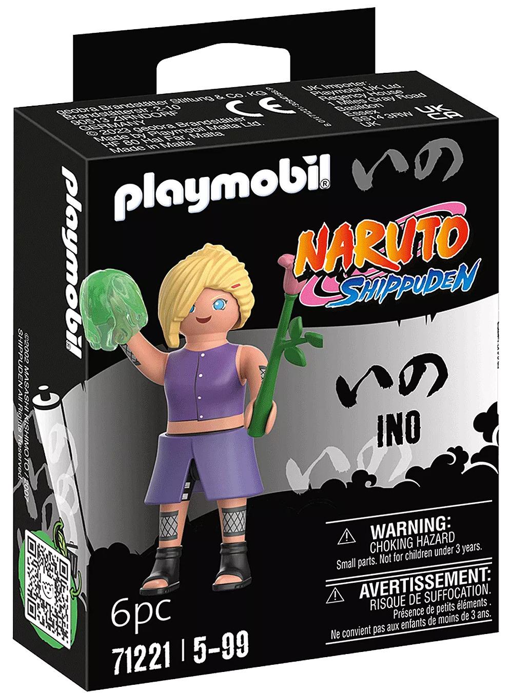 *Playmobil: Naruto Shippuden – Ino (71221)*Ino is the daughter of the head of the Yamanaka clan and Sakura's rival. She can perform Mind Transfer Jutsus.The PLAYMOBIL Anime universe continues to expand! All anime fans can look forward to new characters from the exciting NARUTO universe. The creative figures captivate with many details and cool accessories from the popular successful series and are a real eye-catcher in any fan merchandise display. The PLAYMOBIL set includes the NARUTO SHIPPUDEN character Ino with a chakra ball and flower. Due to her skirt, the figure cannot sit. For a secure display, Ino can be placed on the stand plate.*Contents:** Figures: 1 Ino;* Accessories: 1 chakra ball, 1 flower, 1 removable hairpiece, 1 stand plate*Suitable for Ages 4+*