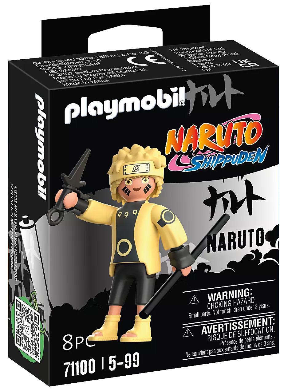 *Playmobil: Naruto Shippuden – Naruto Sage of Six Potions Mode (71100)*As a heightened state of Sage Mode, Naruto's jutsu are augmented with larger amounts of natural energy and the Six paths power to make them stronger.The successful collaboration between PLAYMOBIL and NARUTO goes into the second round. All anime fans can look forward to new characters from the exciting NARUTO universe. The creative figures inspire with lots of details and cool accessories from the well-known hit series and are the eye-catcher in every fan article showcase. Join the sympathetic Naruto Uzumaki on his adventurous journey to become Hokage. The PLAYMOBIL set includes NARUTO SHIPPUDEN character Naruto Uzumaki in Sage of the Six Paths Mode with yellow top, black pants and yellow sandals, as well as a staff and kunai.*Contents:** Figures: 1 Naruto;* Accessories: 1 bar, 1 Kunai*Suitable for Ages 4+*