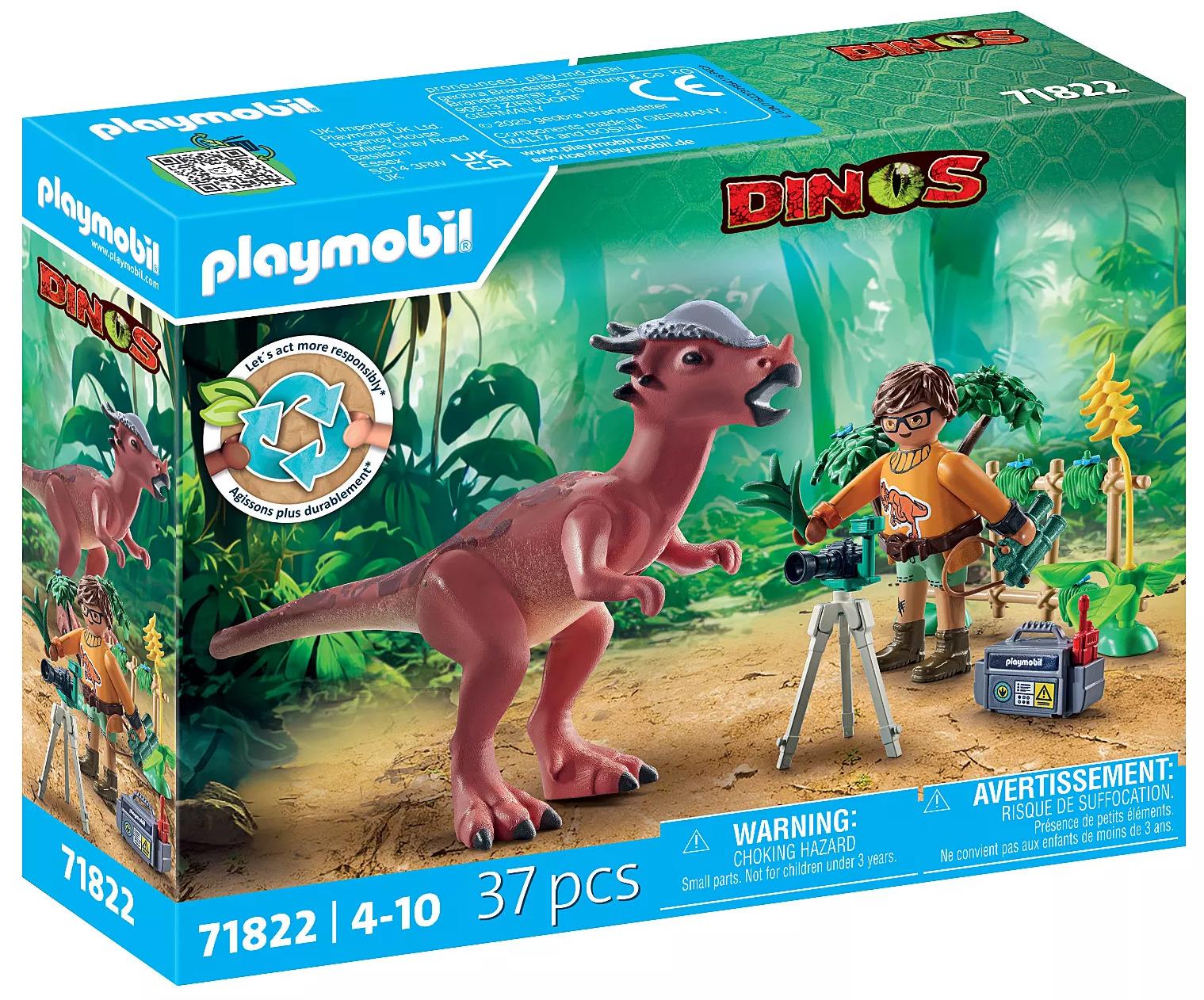 *Playmobil: Stygimoloch Observation (71822)*A researcher observes from a safe distance as the red Stygimoloch, known for its impressively robust head, roams the landscape. He skillfully captures these thrilling moments on camera, slightly worried that the dinosaur might spot him and effortlessly tear down the fence. Fortunately, he has brought along some tasty plants to feed the Stygimoloch. Includes a dinosaur knowledge card.Venture into the wild with the PLAYMOBIL Stygimoloch Observation set! The mighty Stygimoloch can hold plants with its mouth. Equipped with binoculars, a camera, and a tripod, the researcher captures breathtaking moments. Learn fascinating dino facts with the included knowledge card. Made on average from over 80% recycled and bio-based materials, this PLAYMOBIL set offers endless fun for budding paleontologists and nature enthusiasts alike!*Contents:** Figures: 1 man, 1 stygimoloch* Accessories: 1 grass, 5 flowers, 1 binoculars with strap, 2 base plates, 1 camera, 1 flash, 1 ladder, 1 suitcase, 2 photos, 1 walkie-talkie, 1 banana, 3 overhanging grass, 1 tripod, 1 branch, 2 plants, 2 leaf crowns, 1 arm cuff, 1 wristwatch*Suitable for Ages 4+*