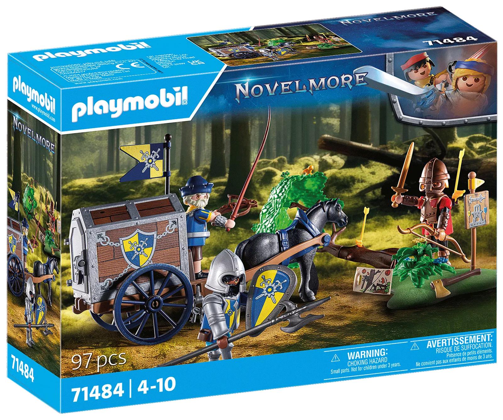 *Playmobil: Transport Robbery (71484)*Valuable cargo loaded! The Novelmorians have dragon gold on board, along with construction plans for special weapons. A knight of the Burnham Raiders tries to stop the transport wagon with the help of a felled tree.The Novelmore knights play world by PLAYMOBIL is full of surprises: In their transport wagon, the Knights of Novelmore not only have secret blueprints but also loaded dragon gold. The Burnham Raiders have their sights on this valuable cargo and fell a tree to stop the transport wagon. However, the Novelmore knights will do everything to defend their property. With great heroes, cunning villains, mysterious creatures, and clever weapons, Novelmore offers immense fun for creative children aged 4 and up. The playset includes three PLAYMOBIL figures, a horse, a base plate with a tilting tree, a bow and arrow, gold, a crossbow, and many other fantastic extras for exciting role-playing in the children's room.*Contents:** Figures: 3 knights* Animals: 1 horse* Accessories: 1 base plate with tilting tree, 1 plant, 1 signpost to the knight's tower, 1 axe, 1 bow, 1 arrow, 1 quiver, 1 knife, 1 sword, 1 whip, 1 shield, 1 lance, 1 amburst, 2 knight's helmets, 1 cap, 1 flag, 2 plans, 1 carriage, 1 chest, gold nugget and dragon stone*Suitable for Ages 4+*