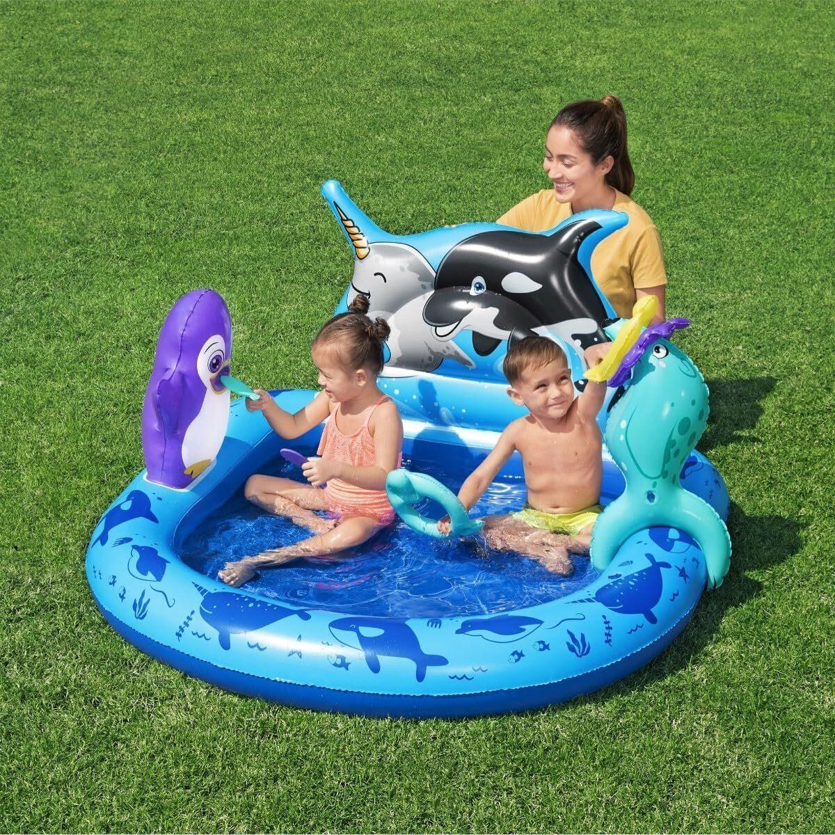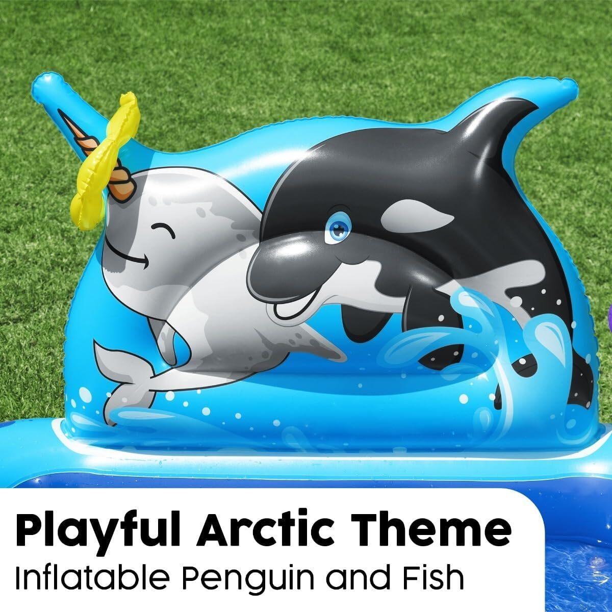 *Bestway: Polar Pals Play Center*Get ready for a “chill” summer of fun with the Bestway Polar Pals Playful arctic theme Inflatable pool! Featuring friendly arctic animals, it has a large play pool area, which includes an inflatable fish ring toss game with 2 possible targets. The pool has a great size for your front or backyard and can be set up by attaching it to the nearest garden hose. Explore all the fun the arctic has to offer!*Features:** Inflated size: 134 × 131 × 73 cm, water capacity: 84 litres, from 2 years* Made from durable PVC* Playful Antarctic design* Ring toss game* Contents: 1 water play centre, 3 fish throwing rings, 2 foam fish, 1 inflatable seal, repair patch*Suitable for Ages 2+*_Due to their lightweight nature, inflatable devices designed for home use may pose a serious risk of injury if not used properly or in bad weather conditions._*Children, especially children under five years, are at high risk of drowning.**Constant parental supervision is required at all times.*