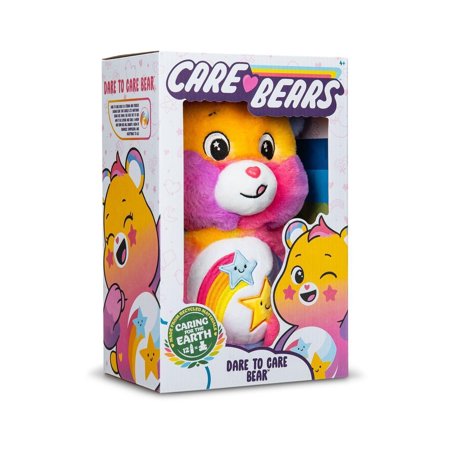 The Care Bears are a group of lovable, huggable BFFS who are all about spreading good caring vibes across the world.As part of their mission of sharing and caring, they want to ensure that we are keeping our earth clean for generations to come by embracing a message of “cleaner and greener is the way to grow!” To champion their message of environmental responsibility, Dare to Care Bear is here to show us how to “go green!” Made with sustainable materials, Dare to Care Bear has been designed with the earth in mind while still maintaining the soft snuggable plush feel that the Care Bears brand is known for.*Features:** SOFT, SUSTAINABLE MATERIALS: Made with sustainable materials, Dare to Care Bear’s plush fur is so snuggable you’ll never want to put your bestie down! Get ready for unlimited bear hugs!* 14″ PLUSHIE: Featured in a beautiful 14-inch plush scale, Dare to Care Bear is the perfect size for taking on adventures of sharing and caring!* UNIQUE BELLY BADGE: Dare to Care Bear wears a fun belly badge featuring two smiling shooting stars, reminding us that while we may be different in some ways, we’re also the same in other ways!* GREAT GIFT IDEA: Dare to Care Bear and all of the Care Bears besties are perfect for any gift giving occasion!* Suitable for ages 4+