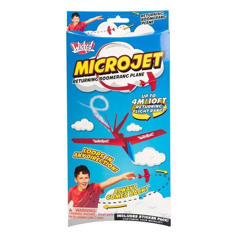 *Wicked: MicroJet*Get ready for take-off with the mighty MicroJet! You’re in the pilot seat of this flying boomerang stunt plane, just throw it in any direction and watch it perform a super smooth flight before returning to your hand!Want a short, high arcing flight. Maybe a long range flight (up to 4 metres) Or how about a death defying loop-the-loop. Simply adjust the tail flaps & wing tips and you’ll be flying like a pilot in no time!*Features:** 1× MicroJet Plane* 1× Sticker Set* 1× Landing Strip*Suitable for Ages 3+*