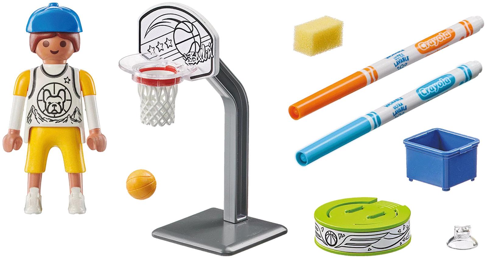 *Playmobil: Color Skater Basketball Player (71516)*Bring color into play with the cool Basketball Playset from PLAYMOBIL Color. Experience vibrant coloring fun with the washable markers.Ultimate playtime fun for creative sports fans is guaranteed with the PLAYMOBIL Color Basketball Player. The basketball player diligently practices at the hoop to improve his shooting accuracy. Simply put the figure on the jumping platform, and the action begins! With the innovative mechanism, the ball can be thrown at different angles – depending on the position of the throwing arm and the operation of the spring. To enhance accuracy, the transparent ring is placed on the hoop. The specially coated label allows for colorful designs with the included markers. Use the included sponge for minor corrections, ensuring ever-new basketball challenges. With the PLAYMOBIL Color Basketball Player, kids become slam-dunk champions!*Contents:** Figures: 1 man with shield cap* Accessories: 1 basketball hoop with stand, base plate and shield, 1 jumping platform with suspension for basketball players, 1 throwing aid for basketball, 1 basketball, 2 thin Crayola pens, 1 sponge, 1 paintable and washable sticker sheet*Suitable for Ages 5+*