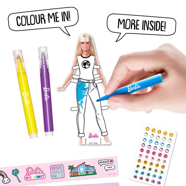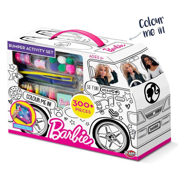 *Awesome colour-in Camper van style box with carry handles contains 300 pieces to create amazing Barbie projects!*With pens, pencils, washi tape, cool ink stampers, stick on gems, pom poms, stickers on rolls, a sticker book and much more! Even includes mini card Barbie dolls with paper outfits to colour & decorate. You can display them on the cardboard ‘fashion runway’ backdrop included! What will you create?*Features:** 300pcs Barbie themed activity pieces with cardboard dolls and fashion runway included!* Including colour-in card dolls, ink stampers, pens, stickers, & much more!* Comes in a Barbie Camper themed box that you can colour in!* Get crafting with this Barbie Bumper Activity Set* Includes 3D colour-in Barbie Catwalk.*Suitable for ages 3 & up*