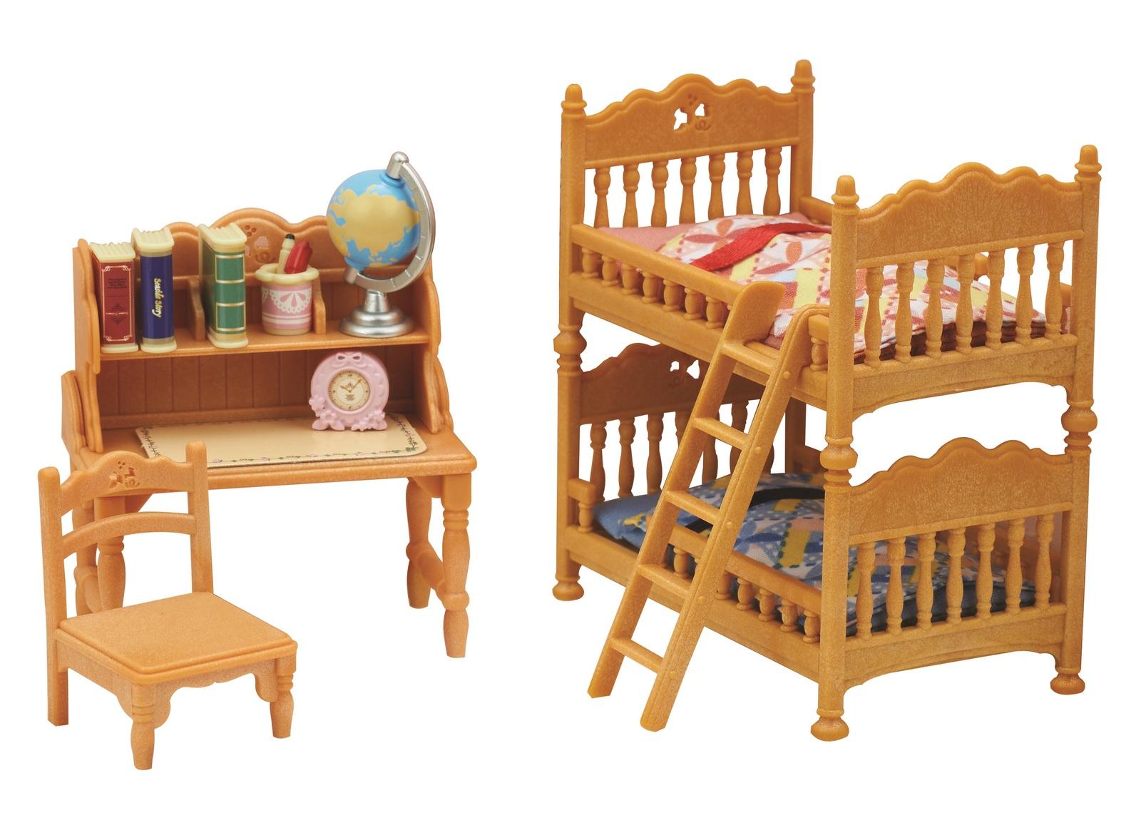 *Sylvanian Families – Children's Bedroom Set*Beech-style beds that are stacked on top of each other to make a bunk bed with a ladder connecting them, this Children’s Bedroom Furniture Set is ideal for a brother and sister sharing. This bedroom set is perfect for children that are just starting to grow up. As well as a work desk unit with books, globe, & pens. (Sylvanians love their stationery!).*Features:** Children's Bedroom Set contains over 15 pieces* Including a set of bunk beds, desk, chair and accessories for child size figures.* Good for stimulating imaginative role-play in children* Figures and other accessories are not included.*Suitable for ages 3 & up*